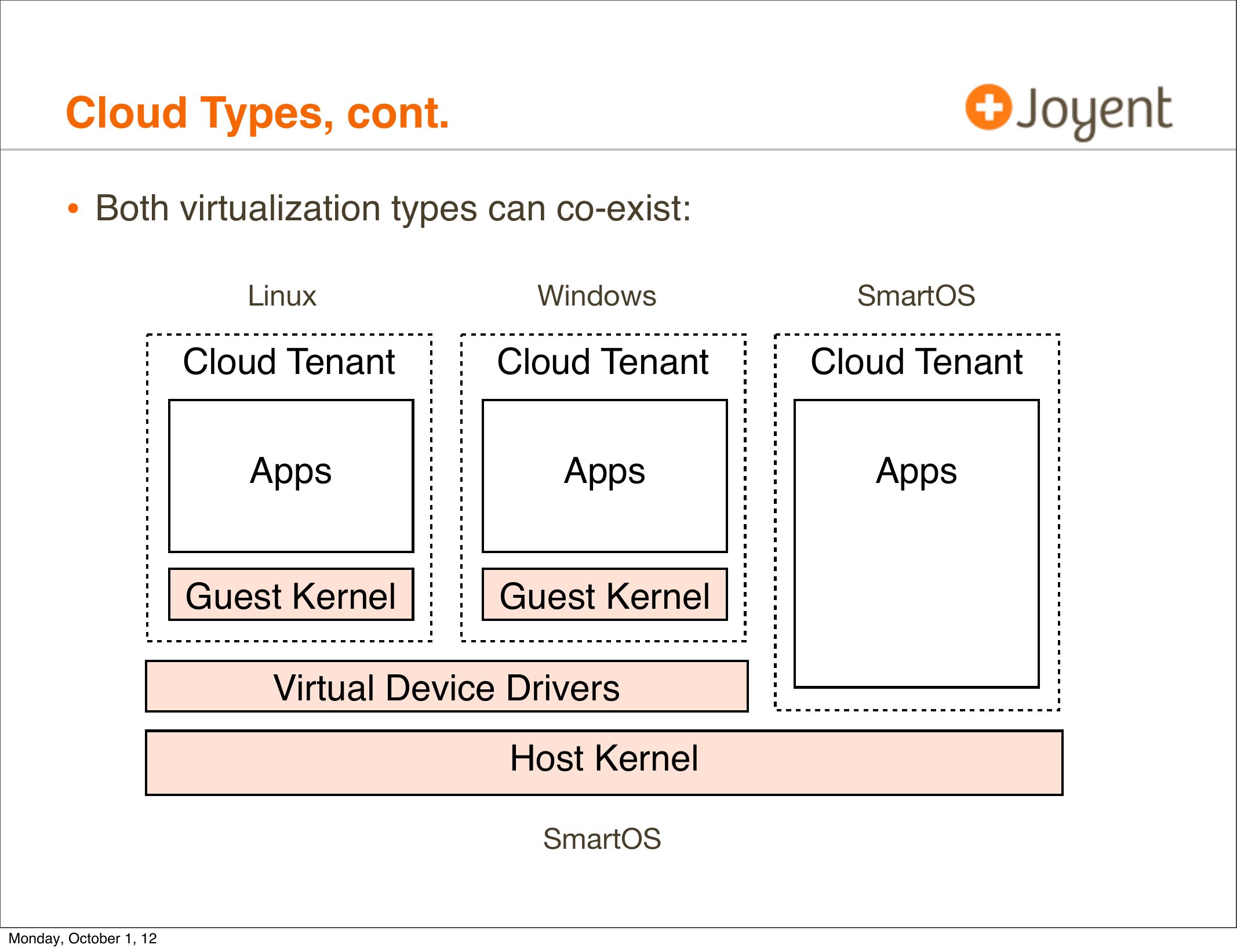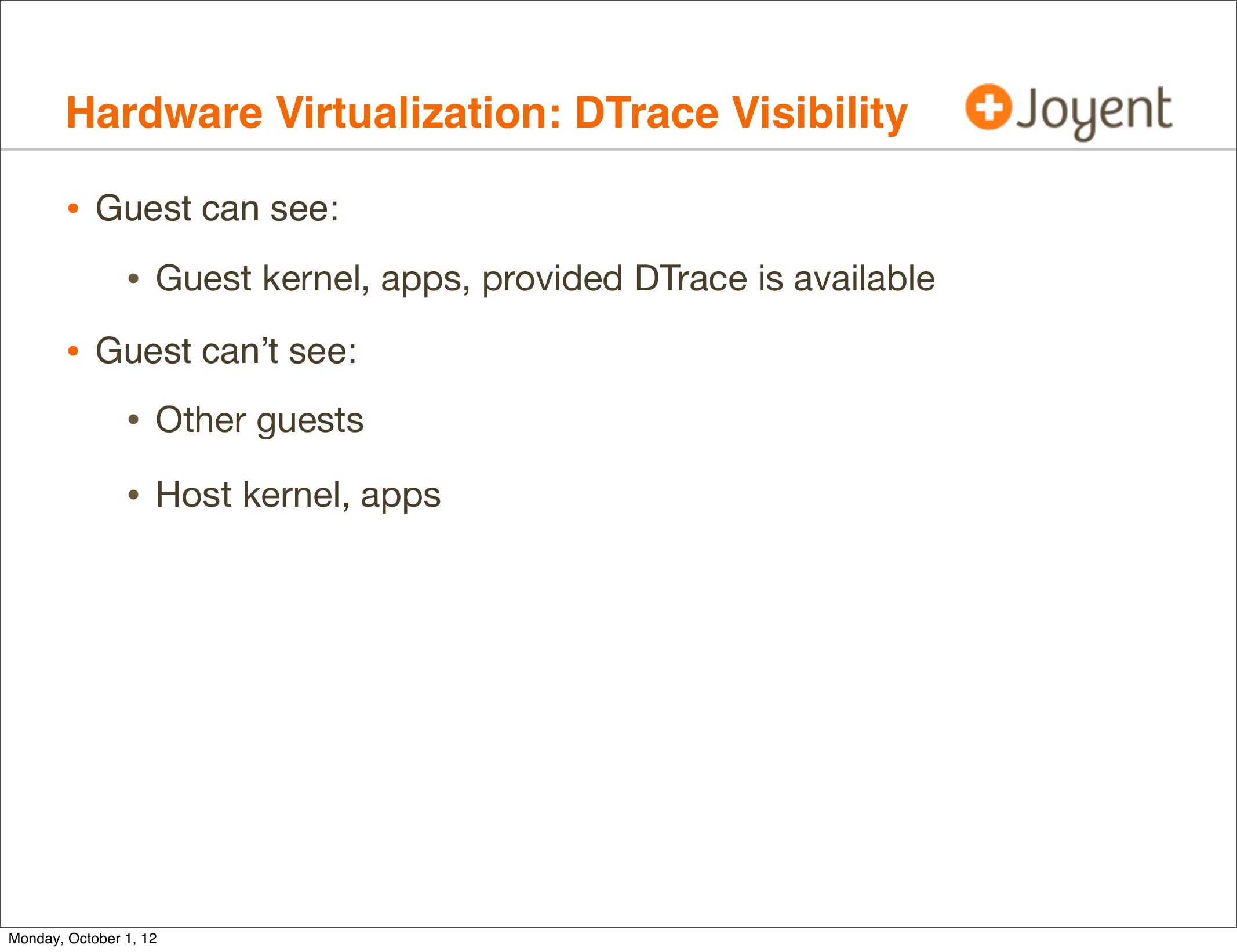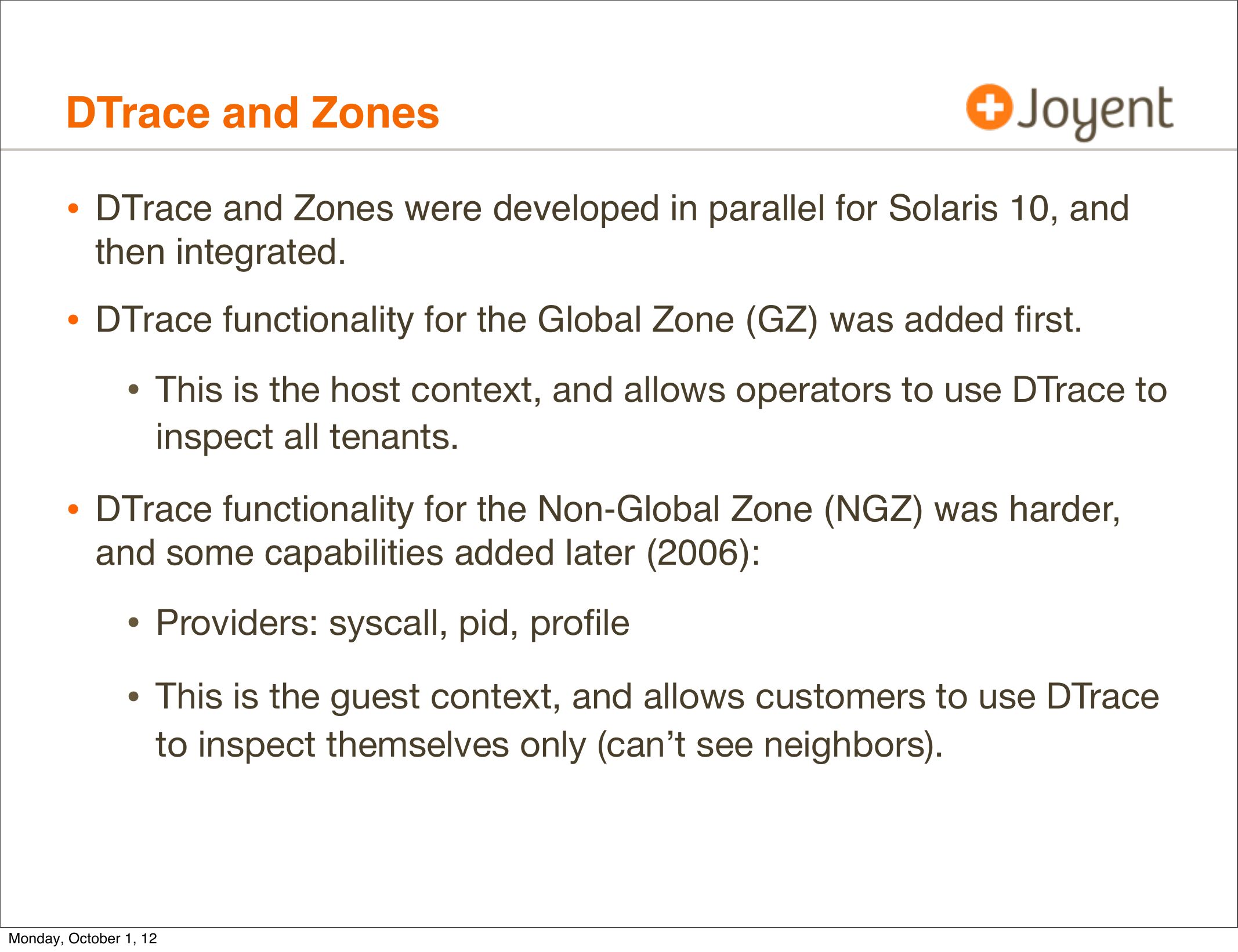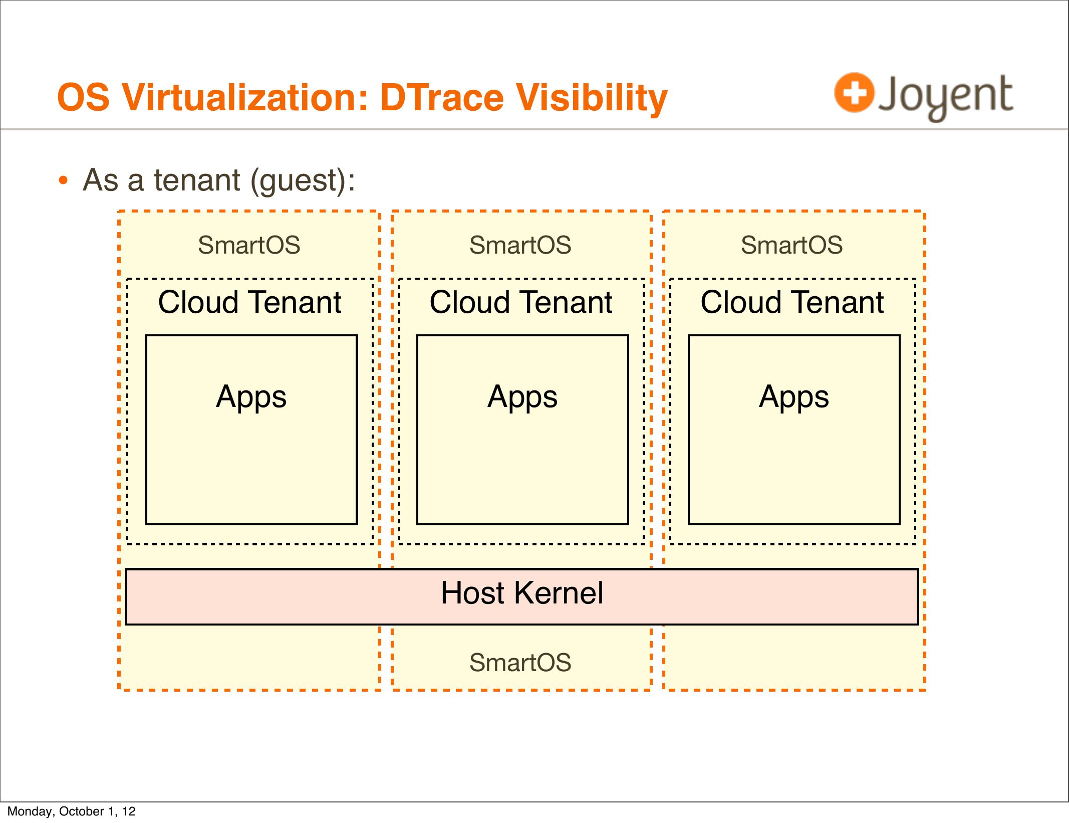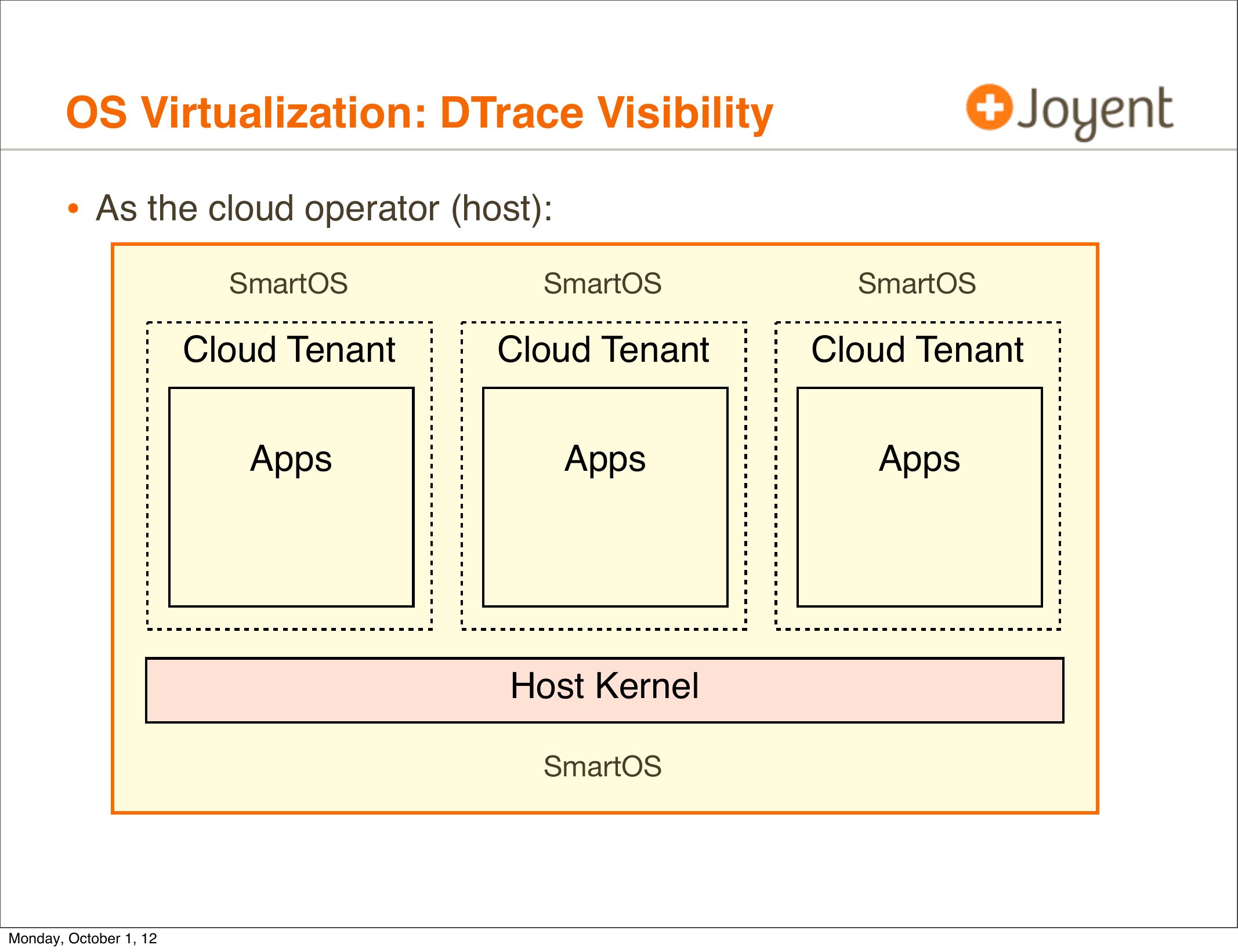For the illumos kernel, DTrace has been enhanced to support cloud computing, providing more observation capabilities to zones as used by Joyent SmartMachine customers. DTrace is also frequently used by the cloud operators to analyze systems and verify performance isolation of tenants.
