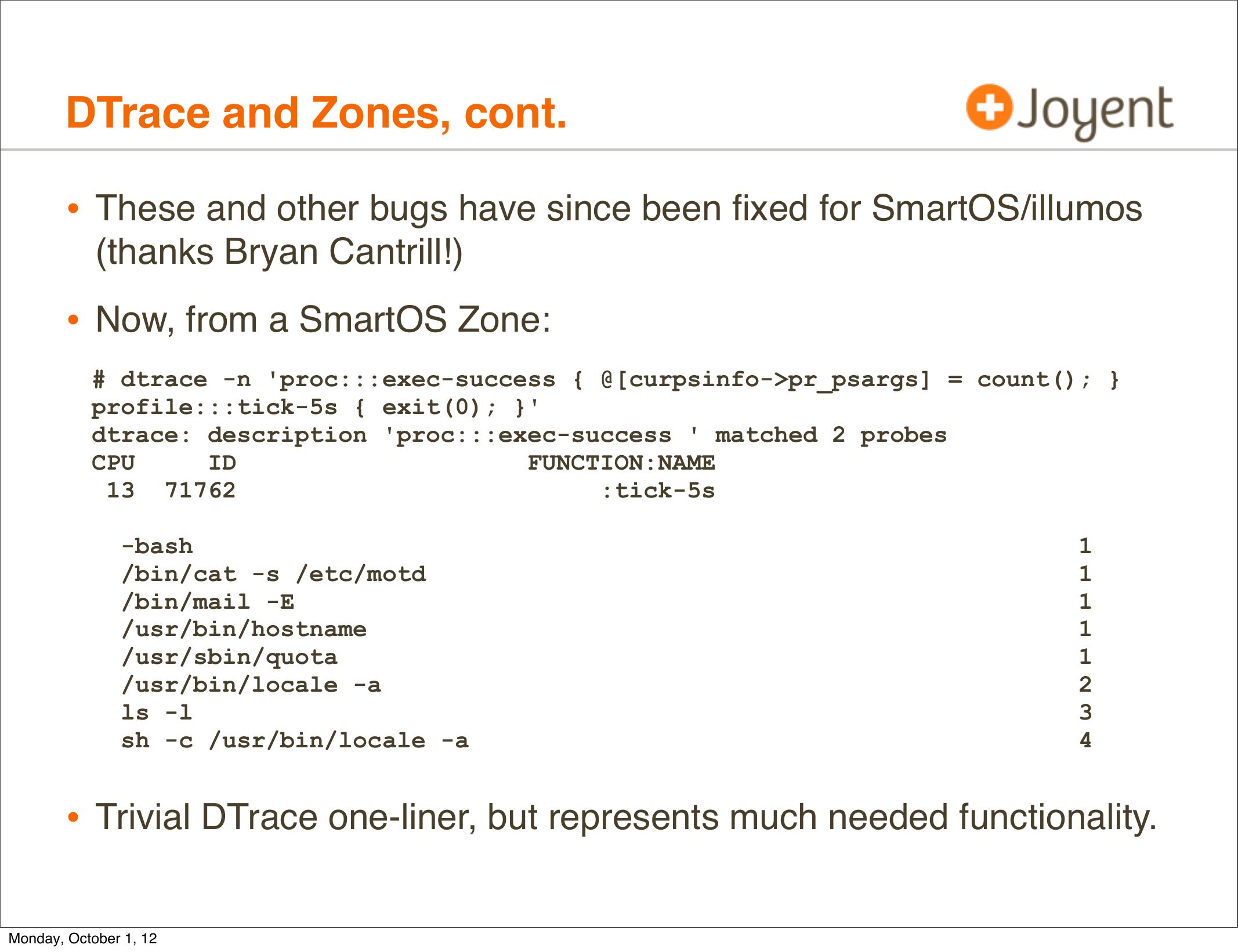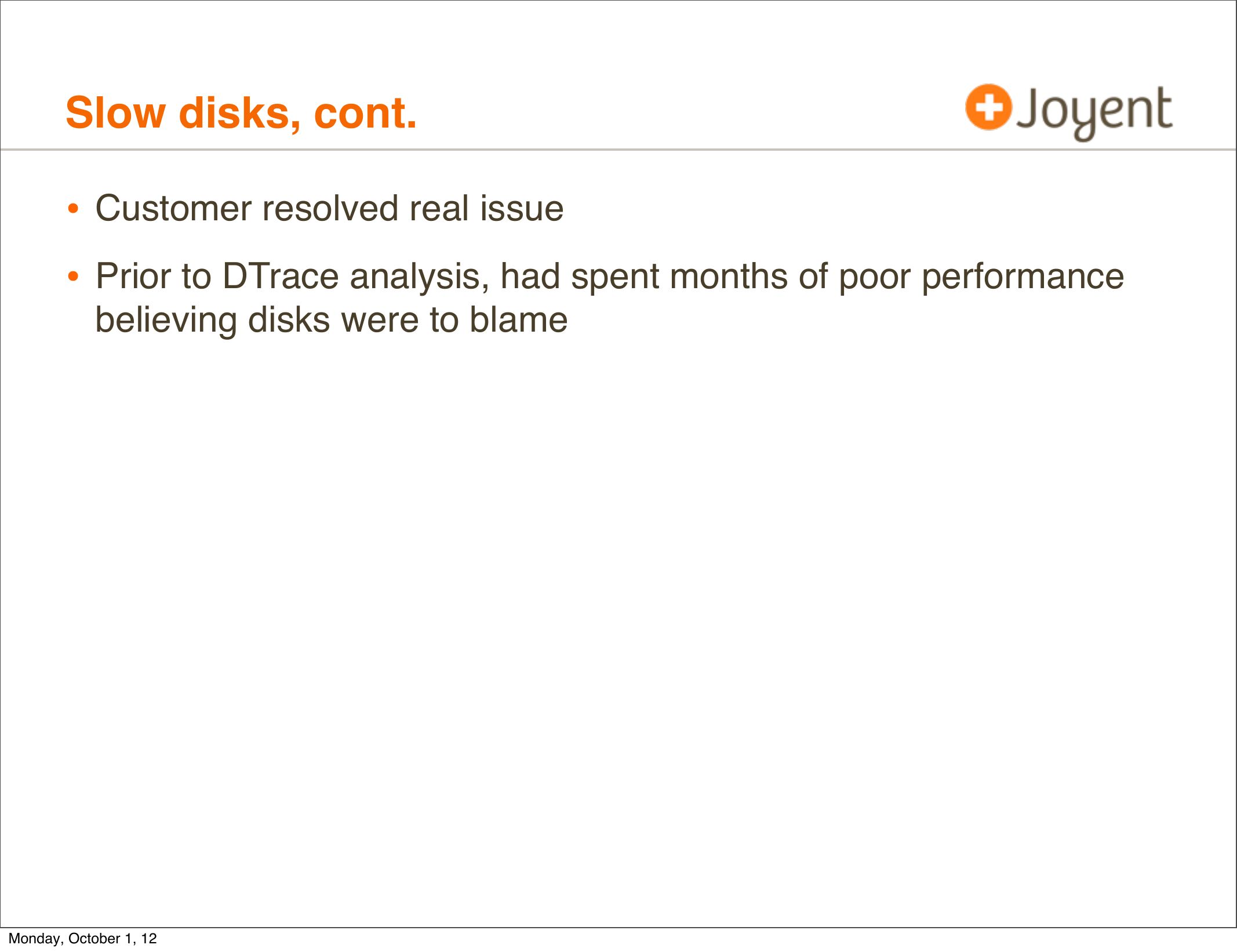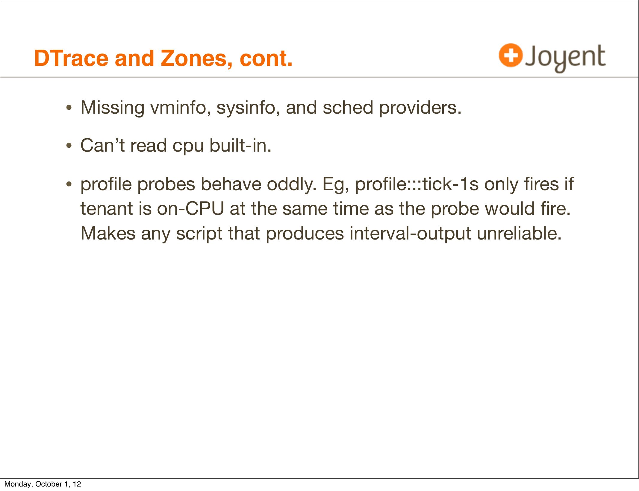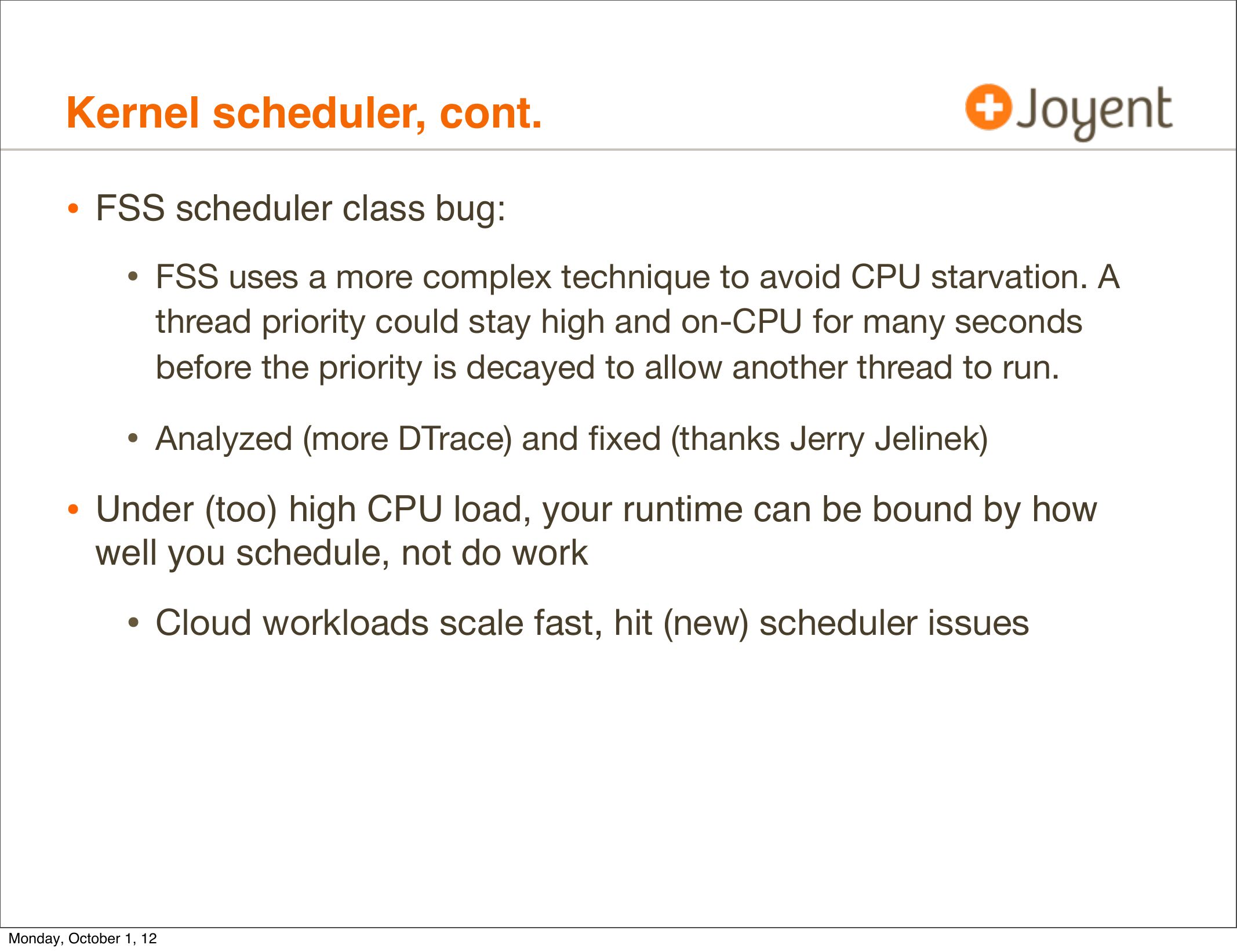 • Analyzed (more DTrace) and fixed (thanks Jerry Jelinek)