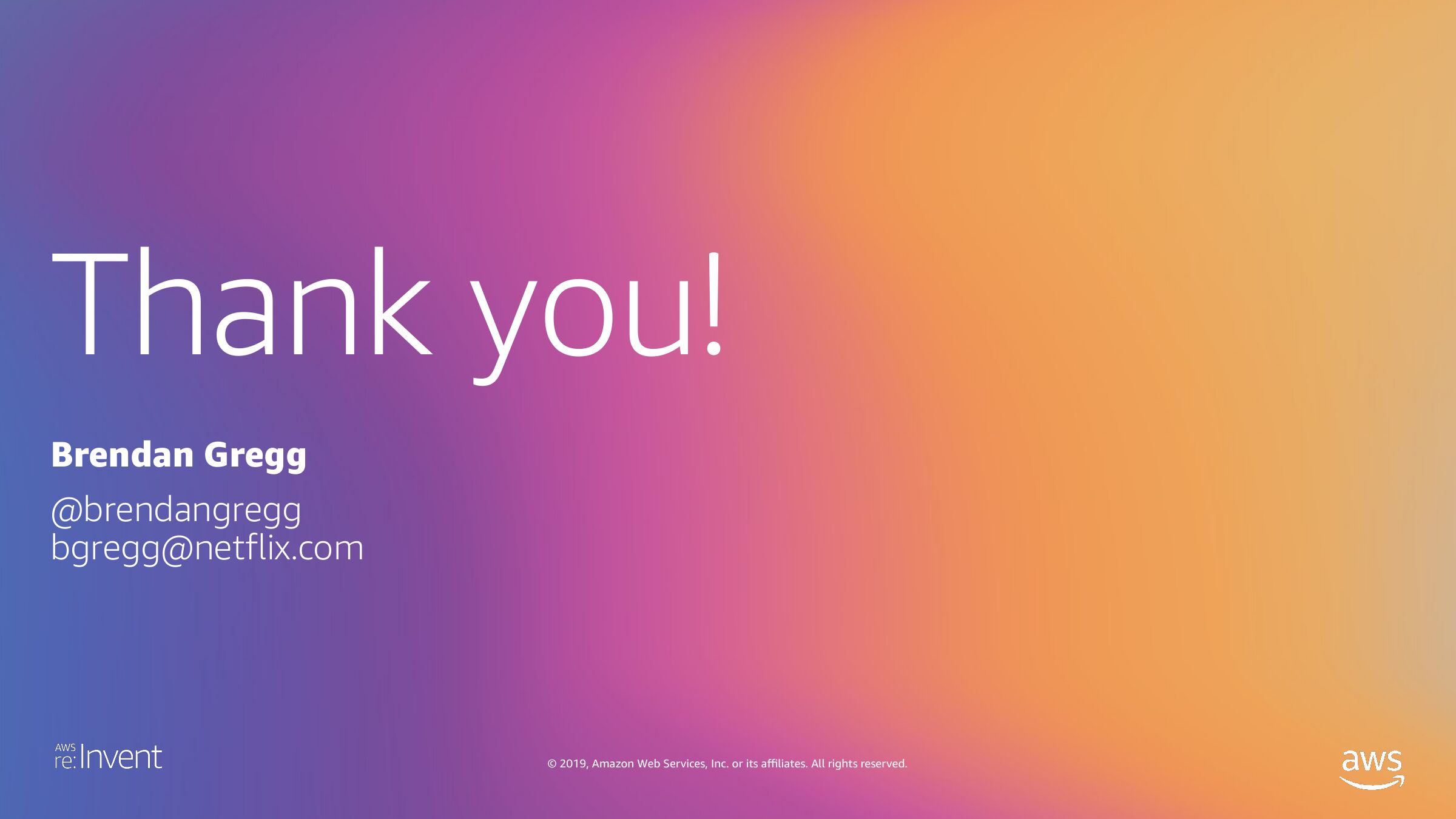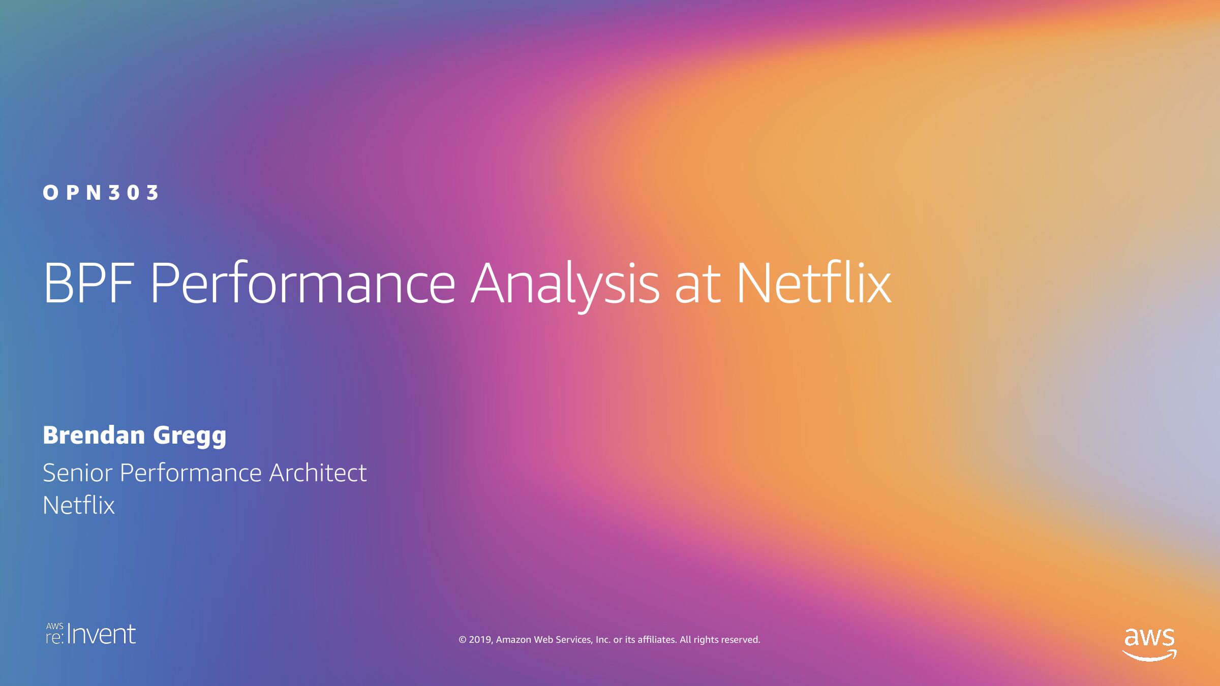 OPN303 BPF Performance Analysis at Netflix Brendan Gregg Senior Performance Architect Netflix © 2019, Amazon Web Services, Inc. or its affiliates. All rights reserved.slide 3: