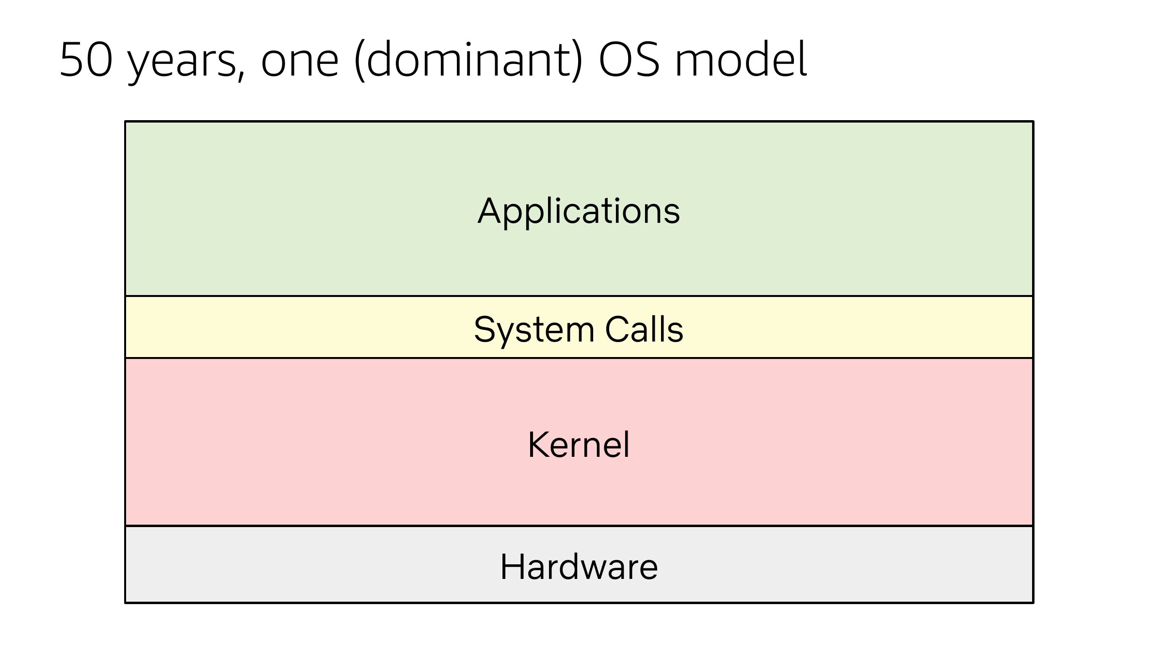 50 years, one (dominant) OS model Applications System Calls Kernel Hardwareslide 7: