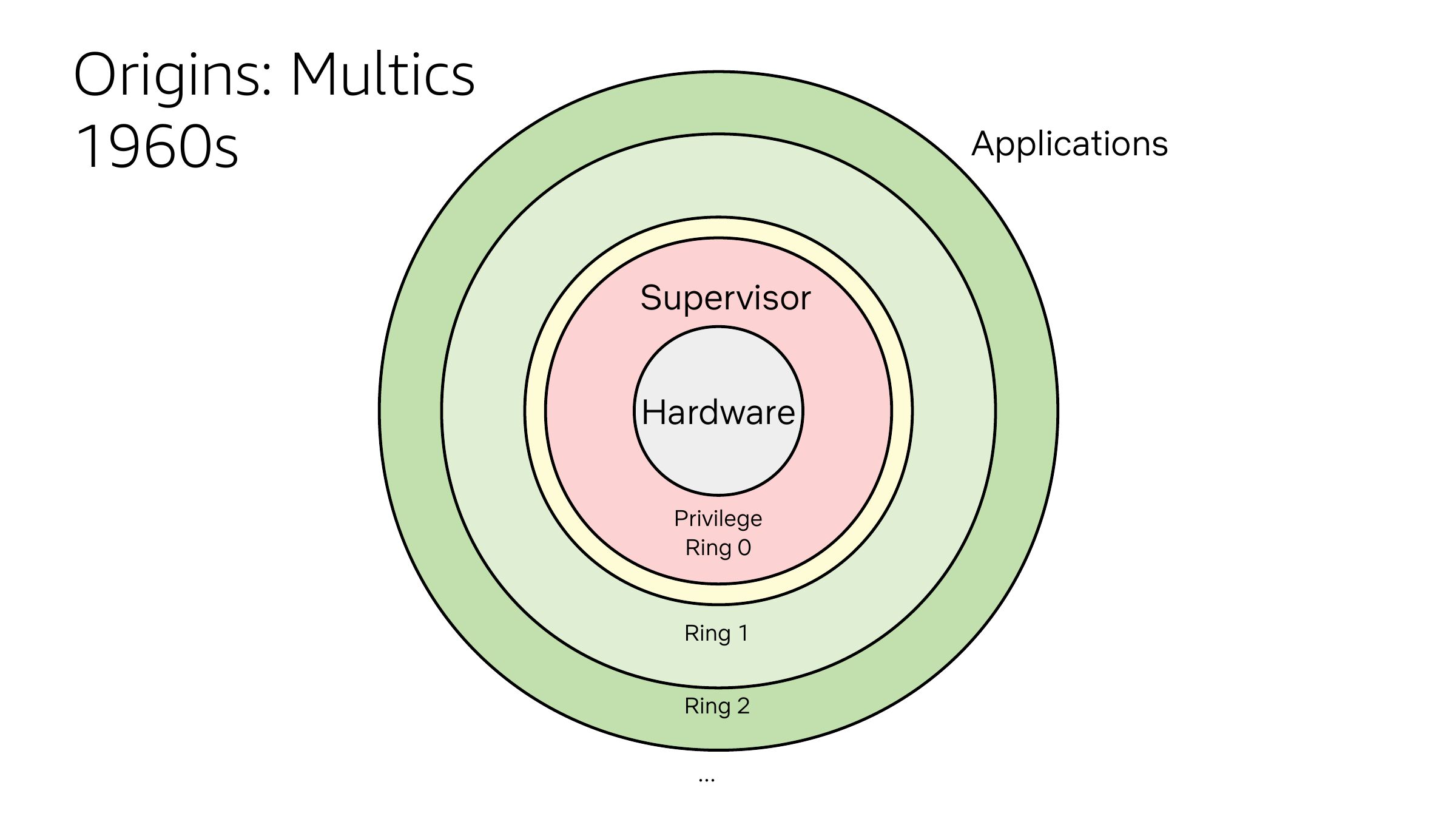 Origins: Multics 1960s Applications Supervisor Hardware Privilege Ring 0 Ring 1 Ring 2slide 8: