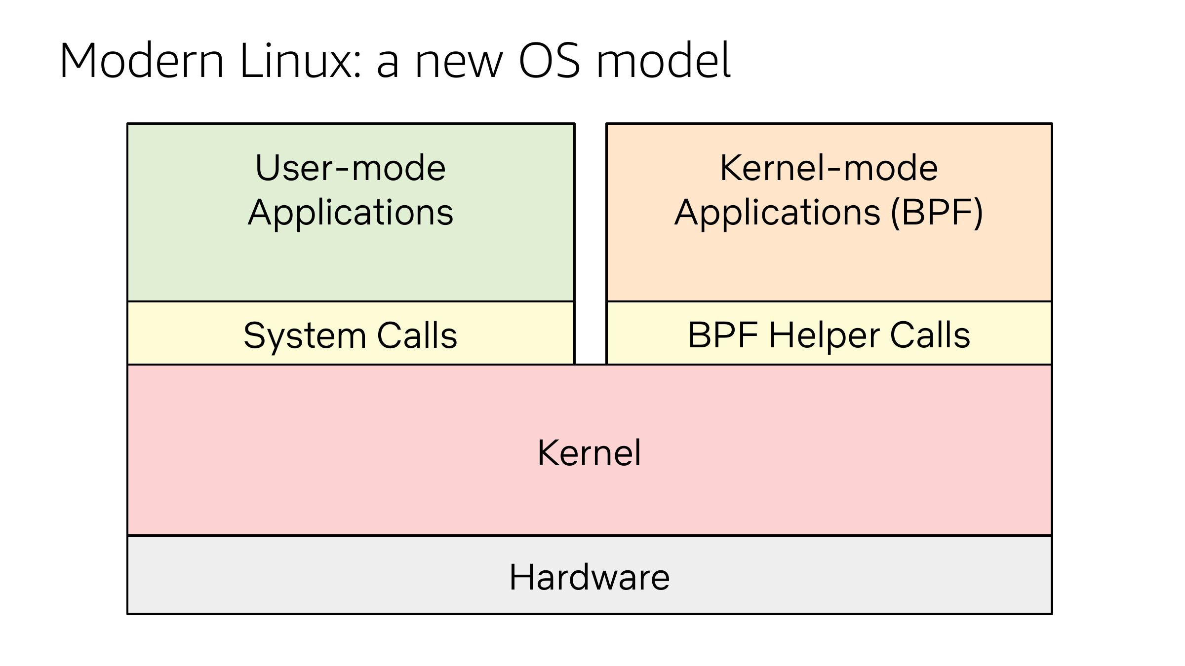 Modern Linux: a new OS model User-mode Applications Kernel-mode Applications (BPF) System Calls BPF Helper Calls Kernel Hardwareslide 9: