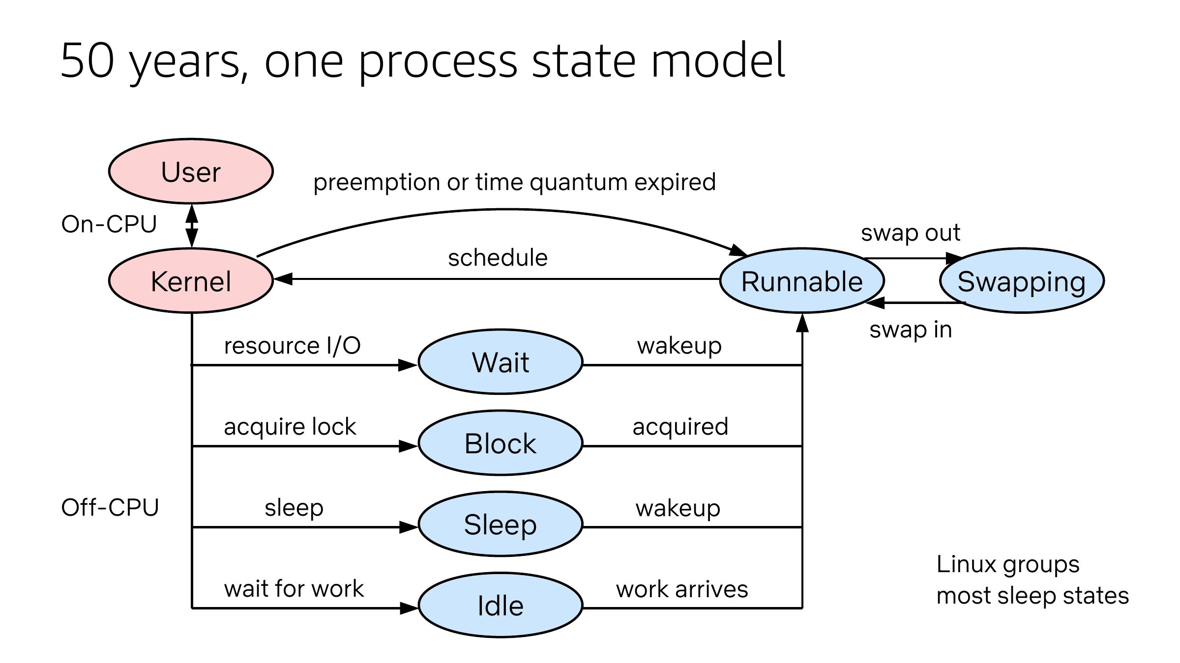 50 years, one process state model User preemption or time quantum expired On-CPU schedule Kernel resource I/O acquire lock Off-CPU swap out sleep wait for work Wait Block Sleep Idle Runnable wakeup Swapping swap in acquired wakeup work arrives Linux groups most sleep statesslide 10: