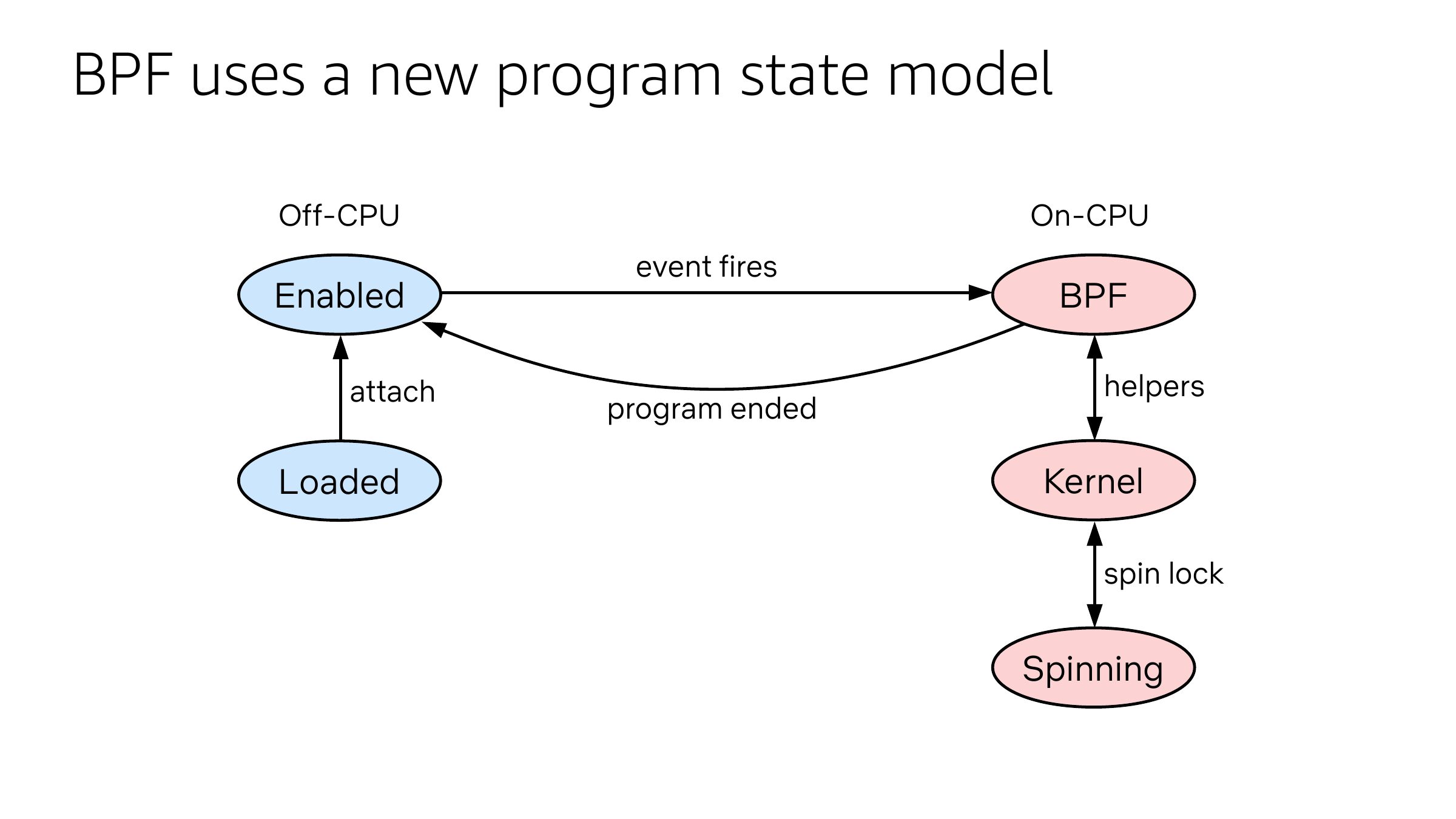 BPF uses a new program state model On-CPU Off-CPU Enabled attach Loaded event fires program ended BPF helpers Kernel spin lock Spinningslide 11: