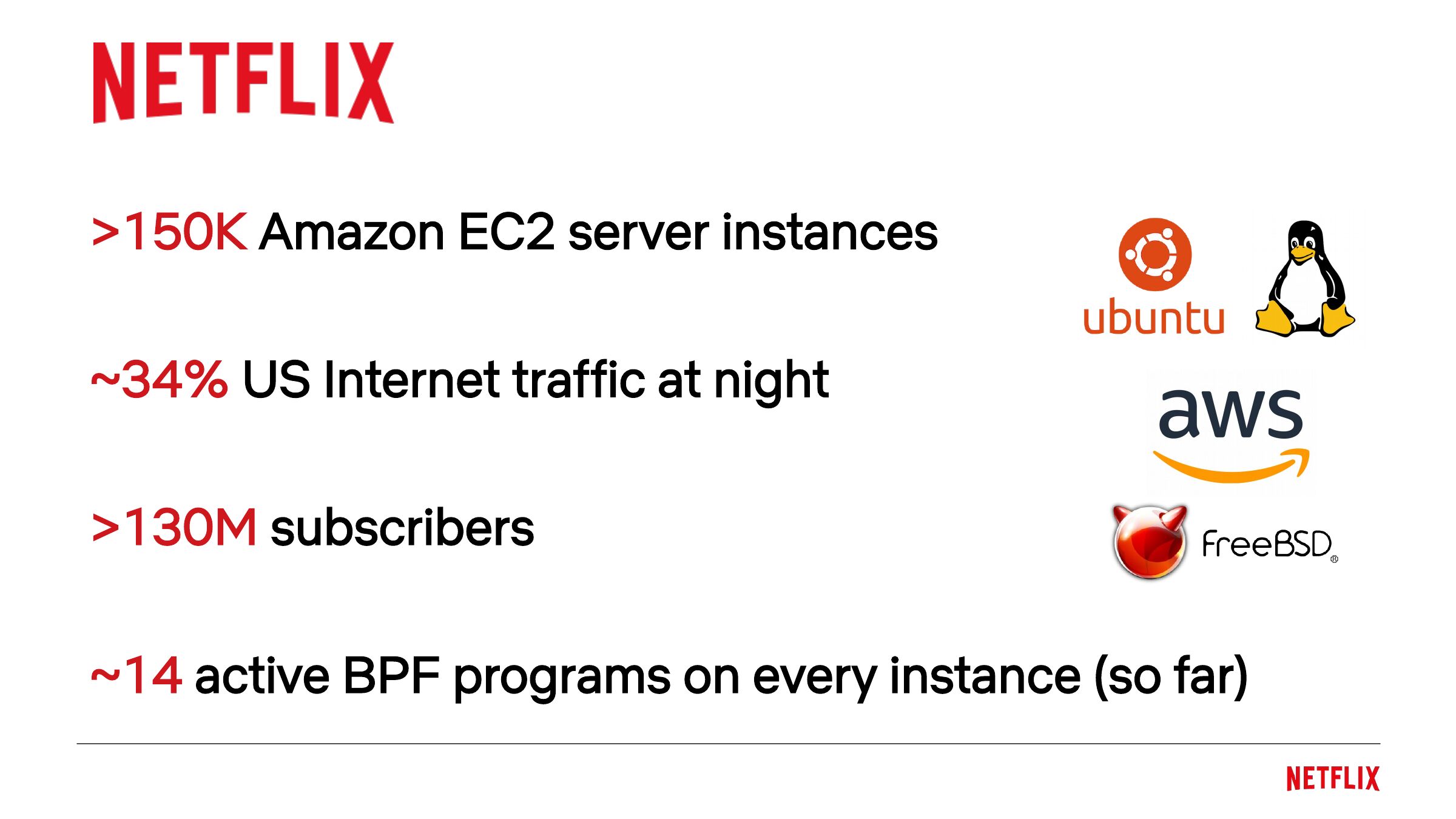 >gt;150K Amazon EC2 server instances ~34% US Internet traffic at night >gt;130M subscribers ~14 active BPF programs on every instance (so far)slide 14: