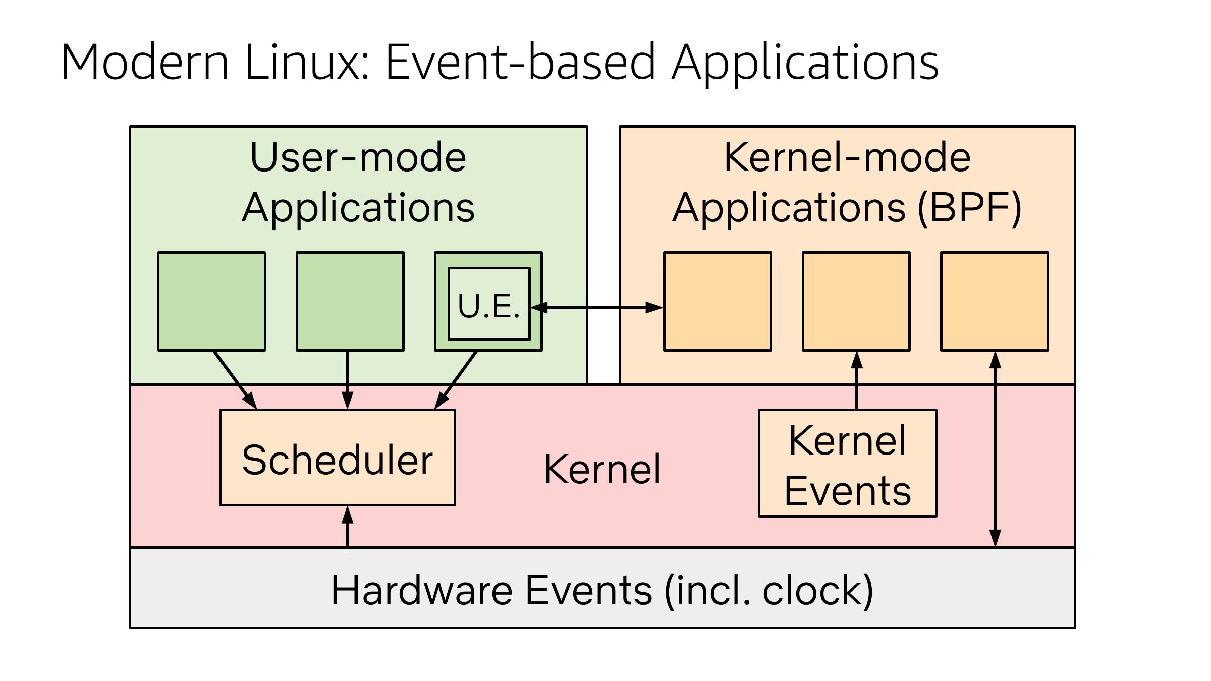 Modern Linux: Event-based Applications Kernel-mode Applications (BPF) User-mode Applications U.E. Scheduler Kernel Kernel Events Hardware Events (incl. clock)slide 15: