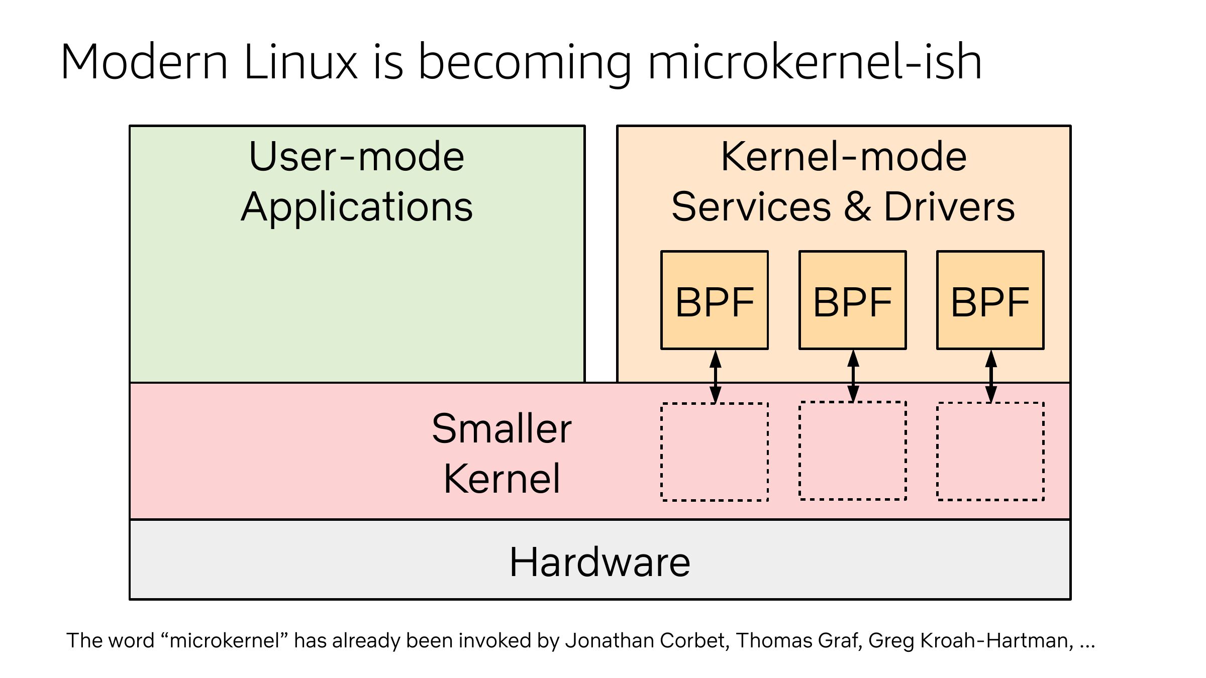 Modern Linux is becoming microkernel-ish Kernel-mode Services & Drivers User-mode Applications BPF BPF BPF Smaller Kernel Hardware The word “microkernel” has already been invoked by Jonathan Corbet, Thomas Graf, Greg Kroah-Hartman, ...slide 16: