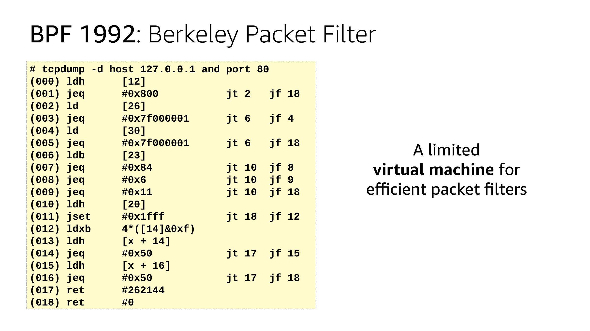 BPF 1992: Berkeley Packet Filter # tcpdump -d host 127.0.0.1 and port 80 (000) ldh [12] (001) jeq #0x800 jt 2 jf 18 (002) ld [26] (003) jeq #0x7f000001 jt 6 jf 4 (004) ld [30] (005) jeq #0x7f000001 jt 6 jf 18 (006) ldb [23] (007) jeq #0x84 jt 10 jf 8 (008) jeq #0x6 jt 10 jf 9 (009) jeq #0x11 jt 10 jf 18 (010) ldh [20] (011) jset #0x1fff jt 18 jf 12 (012) ldxb 4*([14]&0xf) (013) ldh [x + 14] (014) jeq #0x50 jt 17 jf 15 (015) ldh [x + 16] (016) jeq #0x50 jt 17 jf 18 (017) ret #262144 (018) ret A limited virtual machine for efficient packet filtersslide 18:
