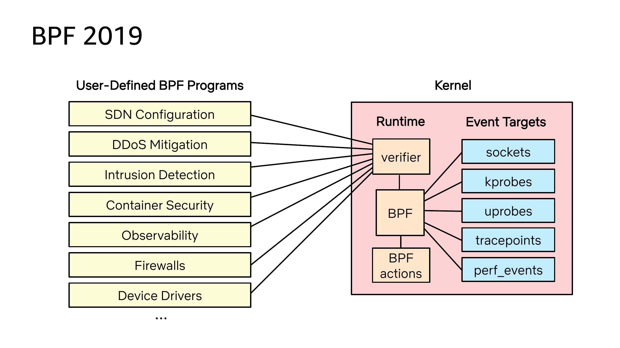 BPF 2019 User-Defined BPF Programs SDN Configuration DDoS Mitigation Kernel Runtime Event Targets verifier sockets Intrusion Detection Container Security kprobes BPF Observability Firewalls Device Drivers uprobes tracepoints BPF actions perf_eventsslide 20: