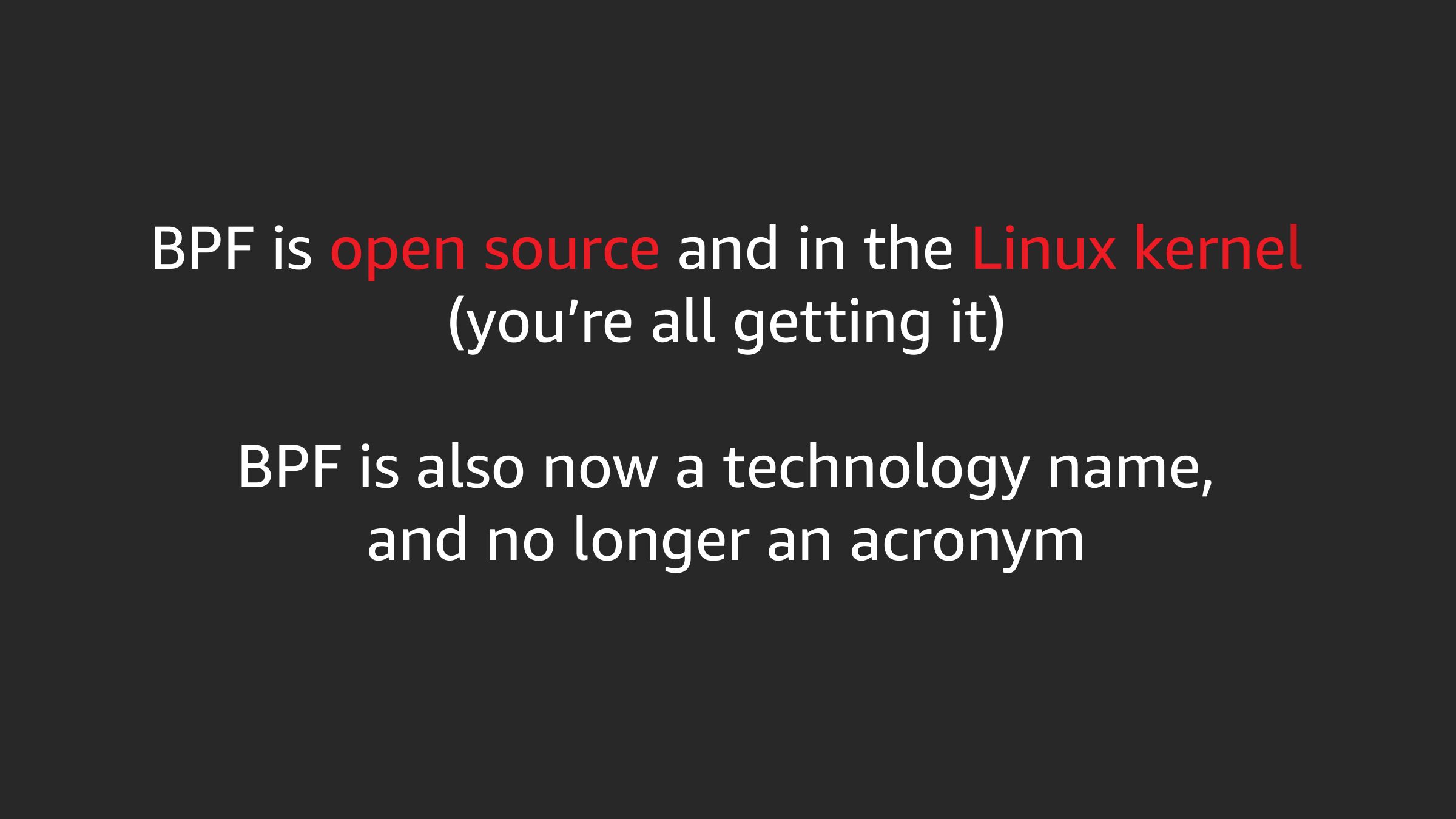 BPF is open source and in the Linux kernel (you’re all getting it) BPF is also now a technology name, and no longer an acronymslide 21: