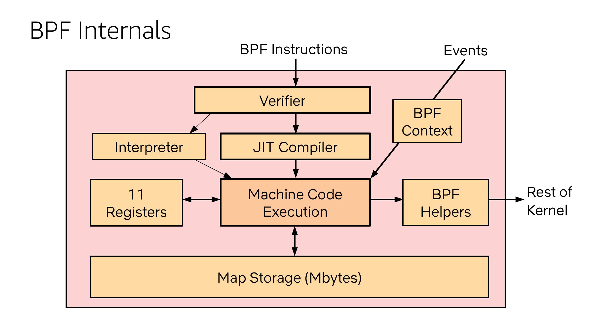 BPF Internals BPF Instructions Verifier Interpreter JIT Compiler Registers Machine Code Execution Map Storage (Mbytes) Events BPF Context BPF Helpers Rest of Kernelslide 22: