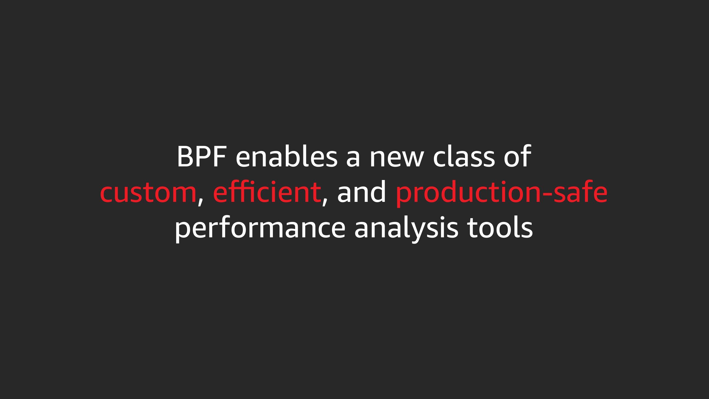 BPF enables a new class of custom, efficient, and production-safe performance analysis toolsslide 26: