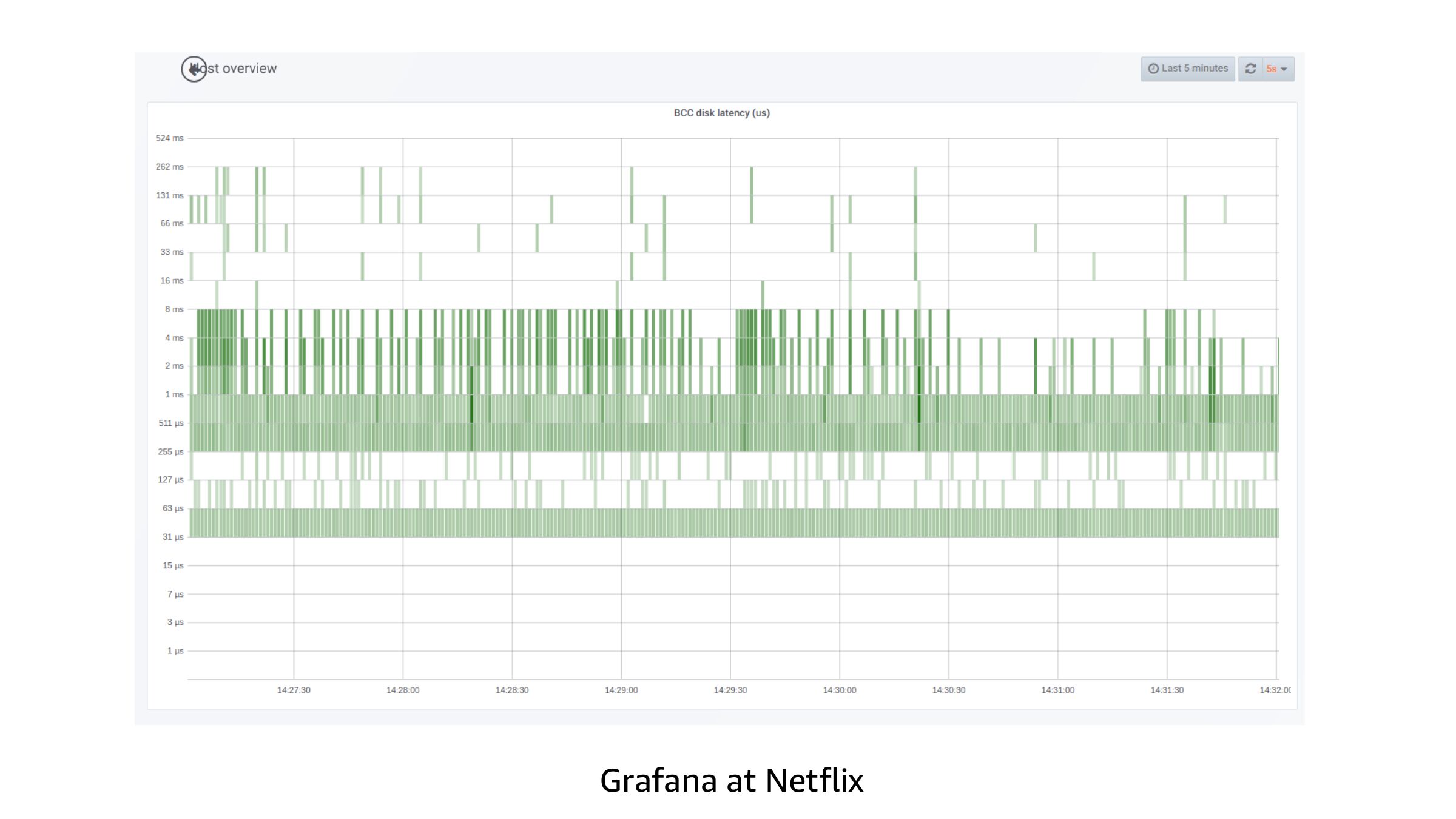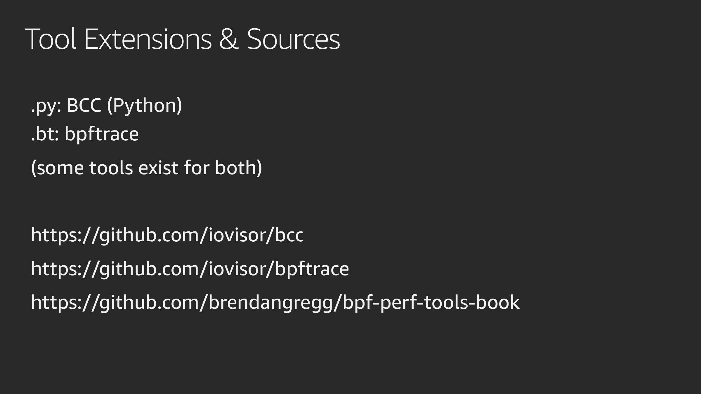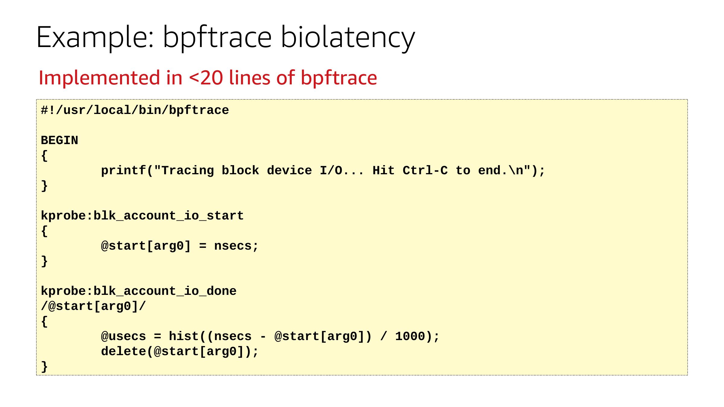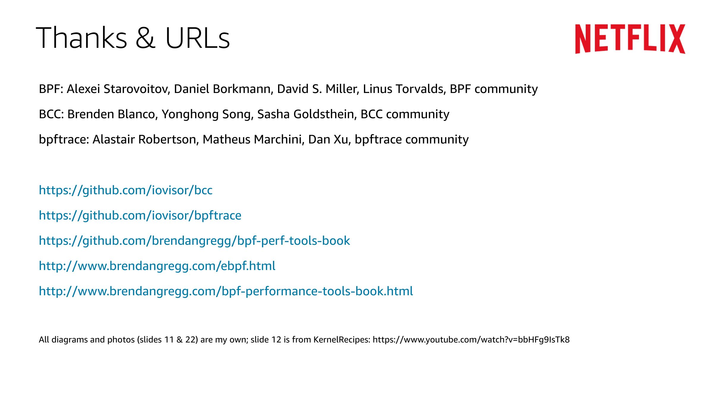 Example: bpftrace biolatency Implemented inslide 60: Netflix Vector (old)slide 61:Grafana at Netflixslide 62:Takeaways Add BCC & bpftrace packages to your servers Start using BPF perf tools directly or via GUIs Identify 1+ engineer at your company to develop tools & GUIs From: BPF Performance Tools: Linux System and Application Observability, Brendan Gregg, Addison Wesley 2019slide 63:Thanks & URLs BPF: Alexei Starovoitov, Daniel Borkmann, David S. Miller, Linus Torvalds, BPF community BCC: Brenden Blanco, Yonghong Song, Sasha Goldsthein, BCC community bpftrace: Alastair Robertson, Matheus Marchini, Dan Xu, bpftrace community https://github.com/iovisor/bcc https://github.com/iovisor/bpftrace https://github.com/brendangregg/bpf-perf-tools-book http://www.brendangregg.com/ebpf.html http://www.brendangregg.com/bpf-performance-tools-book.html All diagrams and photos (slides 11 & 22) are my own; slide 12 is from KernelRecipes: https://www.youtube.com/watch?v=bbHFg9IsTk8slide 64:Thank you! Brendan Gregg @brendangregg bgregg@netflix.com © 2019, Amazon Web Services, Inc. or its affiliates. All rights reserved.slide 65:Please complete the session survey in the mobile app. © 2019, Amazon Web Services, Inc. or its affiliates. All rights reserved.
