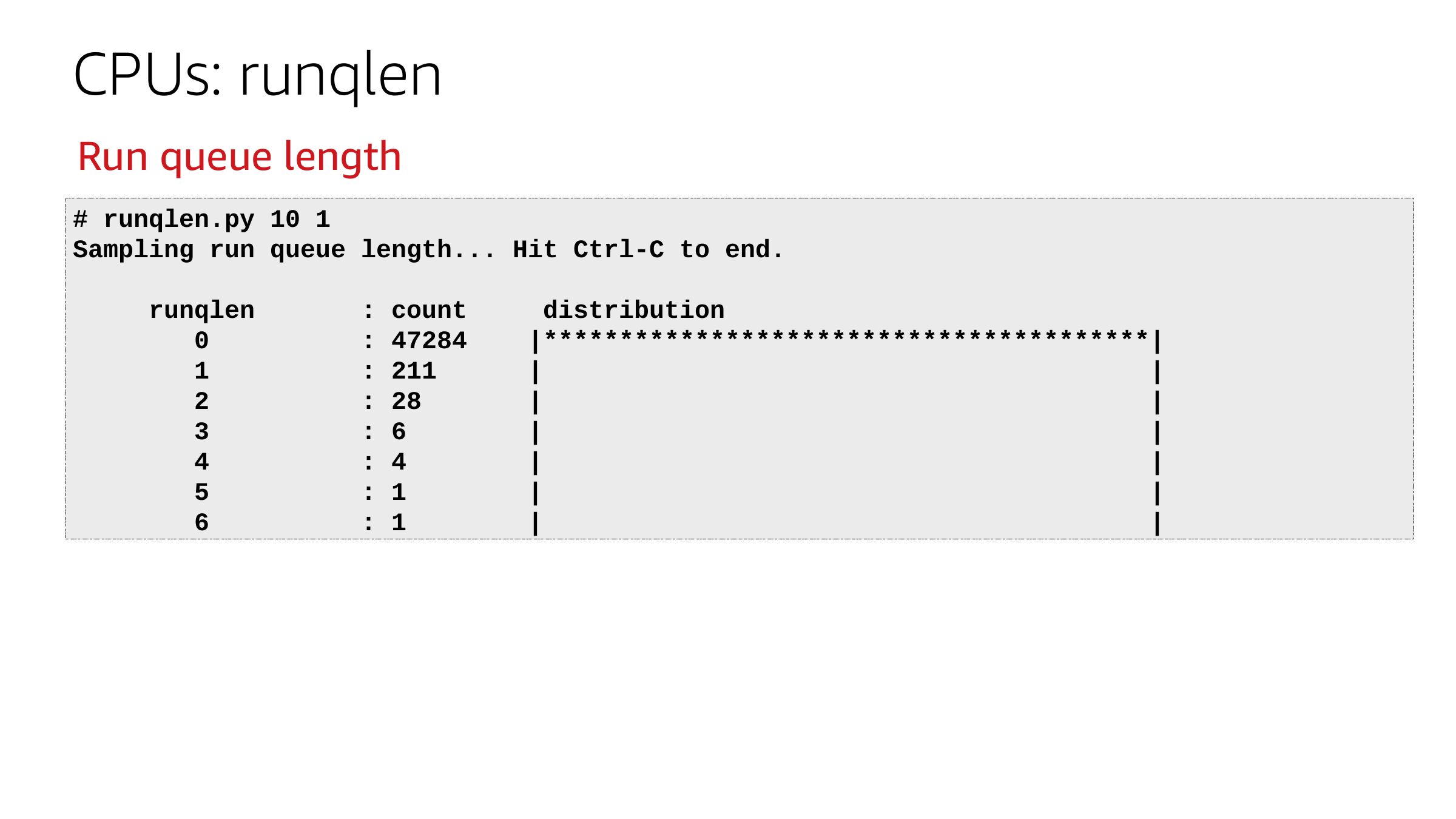 CPUs: runqlen Run queue length # runqlen.py 10 1 Sampling run queue length... Hit Ctrl-C to end. runqlen : count : 47284 : 211 : 28 : 6 : 4 : 1 : 1 distribution |****************************************|slide 32: