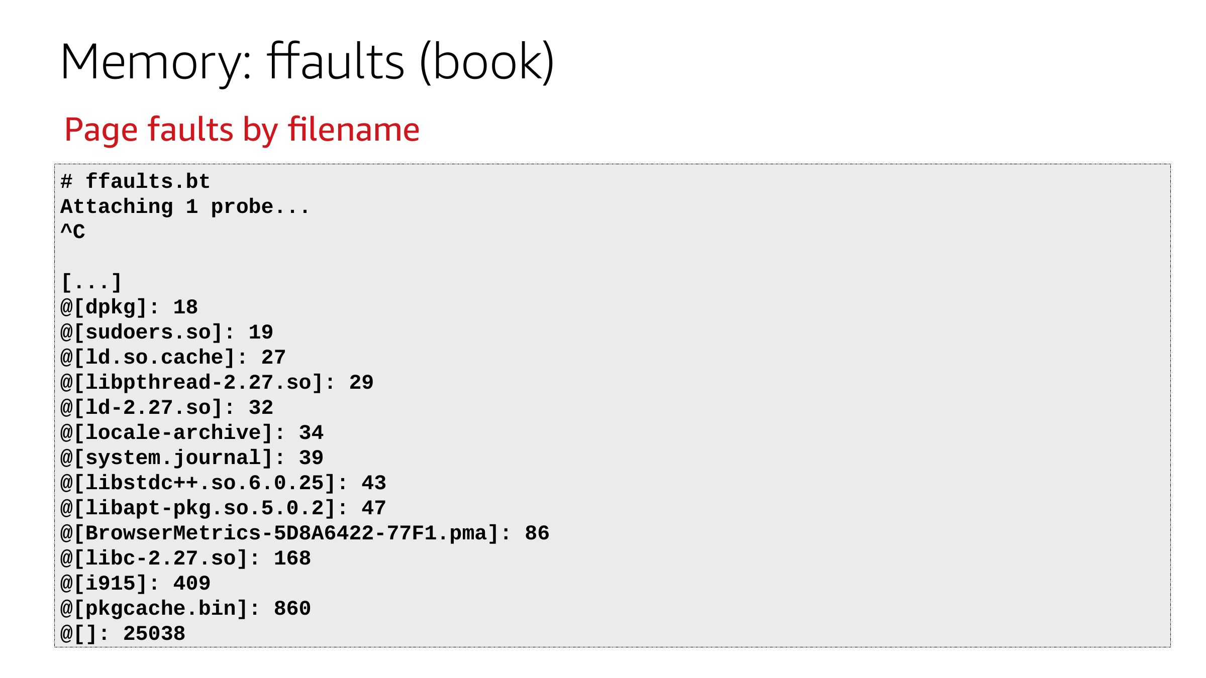 Memory: ffaults (book) Page faults by filename # ffaults.bt Attaching 1 probe... [...] @[dpkg]: 18 @[sudoers.so]: 19 @[ld.so.cache]: 27 @[libpthread-2.27.so]: 29 @[ld-2.27.so]: 32 @[locale-archive]: 34 @[system.journal]: 39 @[libstdc++.so.6.0.25]: 43 @[libapt-pkg.so.5.0.2]: 47 @[BrowserMetrics-5D8A6422-77F1.pma]: 86 @[libc-2.27.so]: 168 @[i915]: 409 @[pkgcache.bin]: 860 @[]: 25038slide 33: