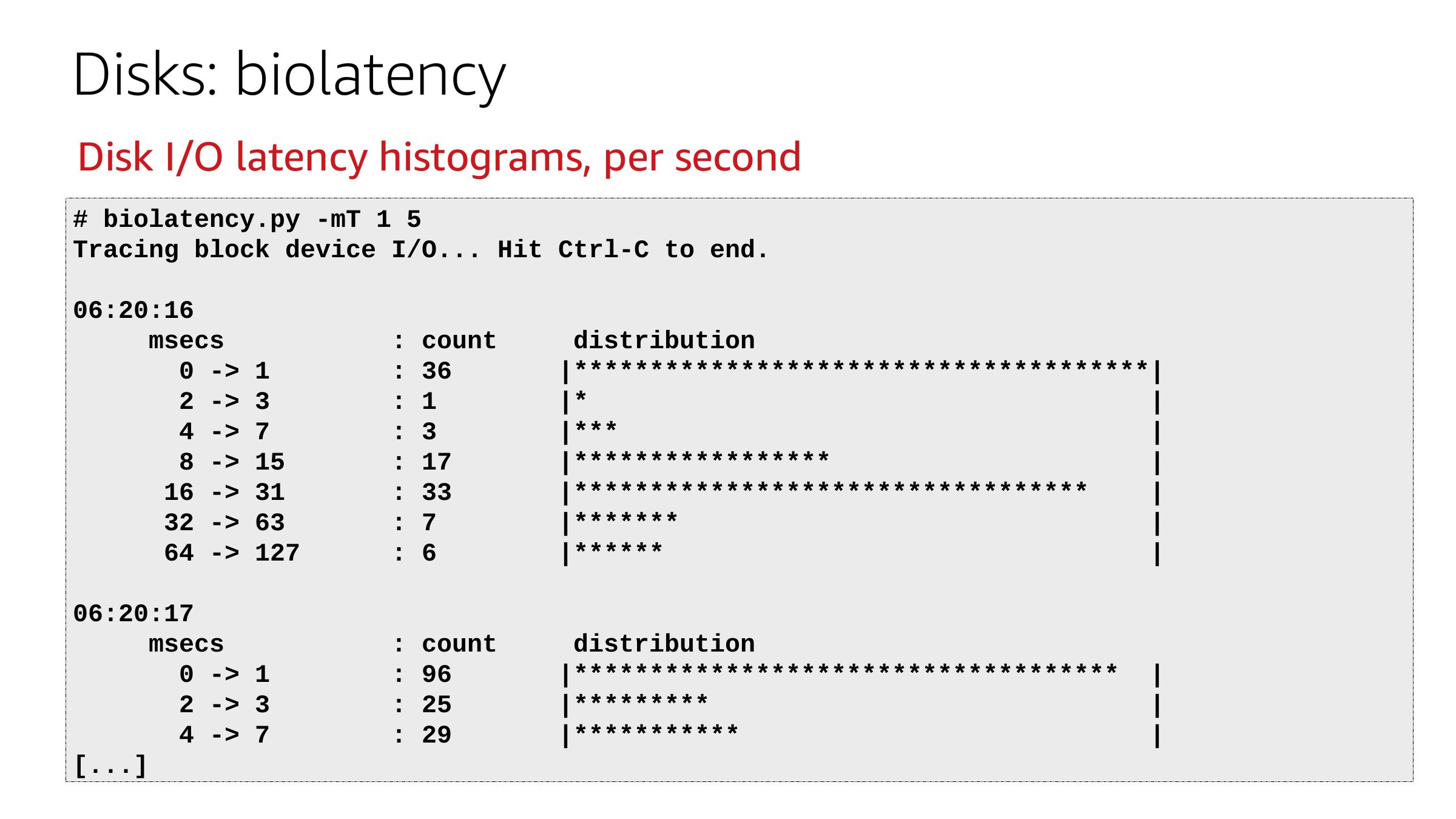 Disks: biolatency Disk I/O latency histograms, per second # biolatency.py -mT 1 5 Tracing block device I/O... Hit Ctrl-C to end. 06:20:16 msecs 0 ->gt; 1 2 ->gt; 3 4 ->gt; 7 8 ->gt; 15 16 ->gt; 31 32 ->gt; 63 64 ->gt; 127 06:20:17 msecs 0 ->gt; 1 2 ->gt; 3 4 ->gt; 7 [...] : count : 36 : 1 : 3 : 17 : 33 : 7 : 6 distribution |**************************************| |*** |***************** |********************************** |******* |****** : count : 96 : 25 : 29 distribution |************************************ |********* |***********slide 34: