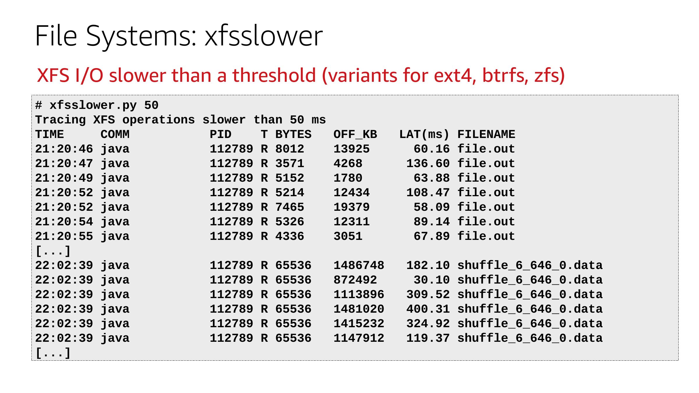 File Systems: xfsslower XFS I/O slower than a threshold (variants for ext4, btrfs, zfs) # xfsslower.py 50 Tracing XFS operations slower than 50 ms TIME COMM PID T BYTES OFF_KB 21:20:46 java 112789 R 8012 21:20:47 java 112789 R 3571 21:20:49 java 112789 R 5152 21:20:52 java 112789 R 5214 21:20:52 java 112789 R 7465 21:20:54 java 112789 R 5326 21:20:55 java 112789 R 4336 [...] 22:02:39 java 112789 R 65536 22:02:39 java 112789 R 65536 22:02:39 java 112789 R 65536 22:02:39 java 112789 R 65536 22:02:39 java 112789 R 65536 22:02:39 java 112789 R 65536 [...] LAT(ms) FILENAME 60.16 file.out 136.60 file.out 63.88 file.out 108.47 file.out 58.09 file.out 89.14 file.out 67.89 file.out 182.10 shuffle_6_646_0.data 30.10 shuffle_6_646_0.data 309.52 shuffle_6_646_0.data 400.31 shuffle_6_646_0.data 324.92 shuffle_6_646_0.data 119.37 shuffle_6_646_0.dataslide 35: