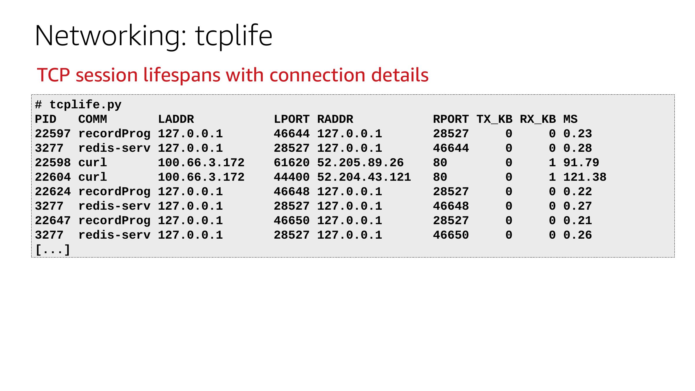 Networking: tcplife TCP session lifespans with connection details # tcplife.py PID COMM LADDR 22597 recordProg 127.0.0.1 3277 redis-serv 127.0.0.1 22598 curl 22604 curl 22624 recordProg 127.0.0.1 3277 redis-serv 127.0.0.1 22647 recordProg 127.0.0.1 3277 redis-serv 127.0.0.1 [...] LPORT RADDR 46644 127.0.0.1 28527 127.0.0.1 61620 52.205.89.26 44400 52.204.43.121 46648 127.0.0.1 28527 127.0.0.1 46650 127.0.0.1 28527 127.0.0.1 RPORT TX_KB RX_KB MS 0 0.23 0 0.28 1 91.79 1 121.38 0 0.22 0 0.27 0 0.21 0 0.26slide 37: