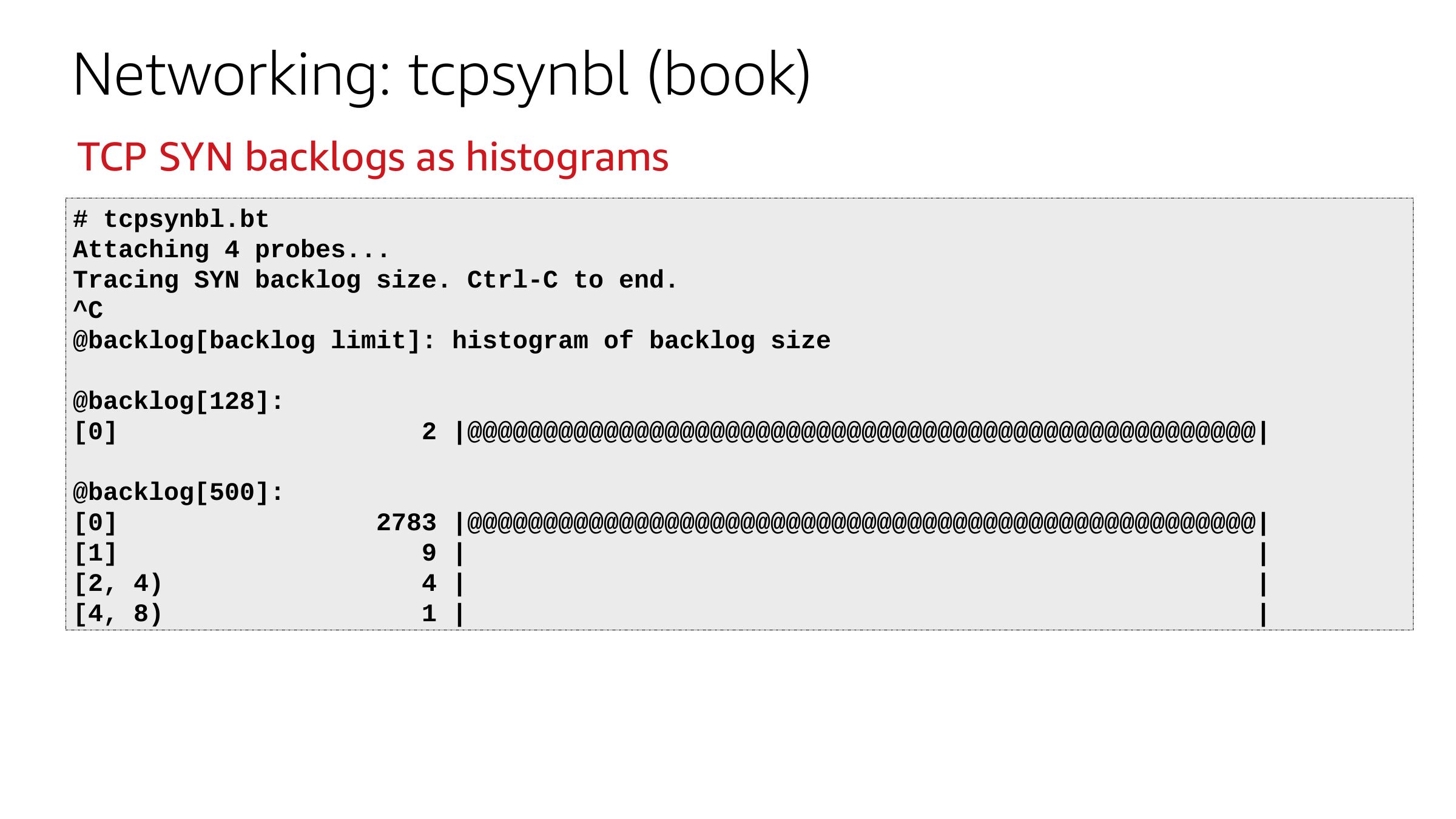 Networking: tcpsynbl (book) TCP SYN backlogs as histograms # tcpsynbl.bt Attaching 4 probes... Tracing SYN backlog size. Ctrl-C to end. @backlog[backlog limit]: histogram of backlog size @backlog[128]: [0] 2 |@@@@@@@@@@@@@@@@@@@@@@@@@@@@@@@@@@@@@@@@@@@@@@@@@@@@| @backlog[500]: [0] [1] [2, 4) [4, 8) 2783 |@@@@@@@@@@@@@@@@@@@@@@@@@@@@@@@@@@@@@@@@@@@@@@@@@@@@| 9 | 4 | 1 |slide 38: