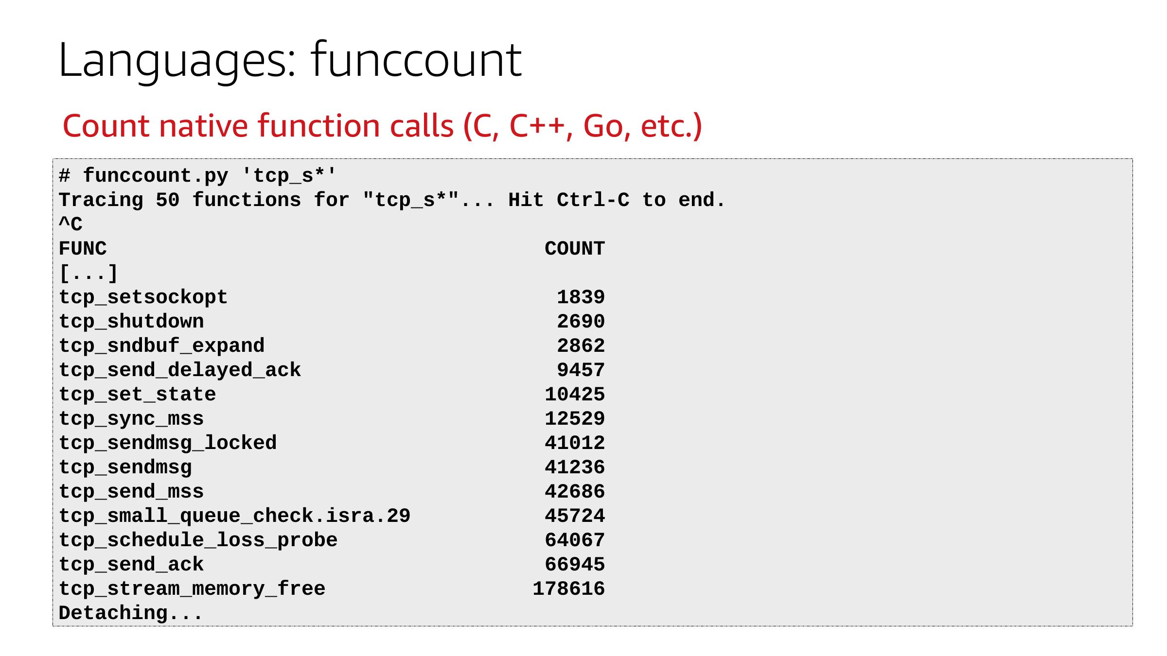 Languages: funccount Count native function calls (C, C++, Go, etc.) # funccount.py 'tcp_s*' Tracing 50 functions for "tcp_s*"... Hit Ctrl-C to end. FUNC COUNT [...] tcp_setsockopt tcp_shutdown tcp_sndbuf_expand tcp_send_delayed_ack tcp_set_state tcp_sync_mss tcp_sendmsg_locked tcp_sendmsg tcp_send_mss tcp_small_queue_check.isra.29 tcp_schedule_loss_probe tcp_send_ack tcp_stream_memory_free Detaching...slide 39: