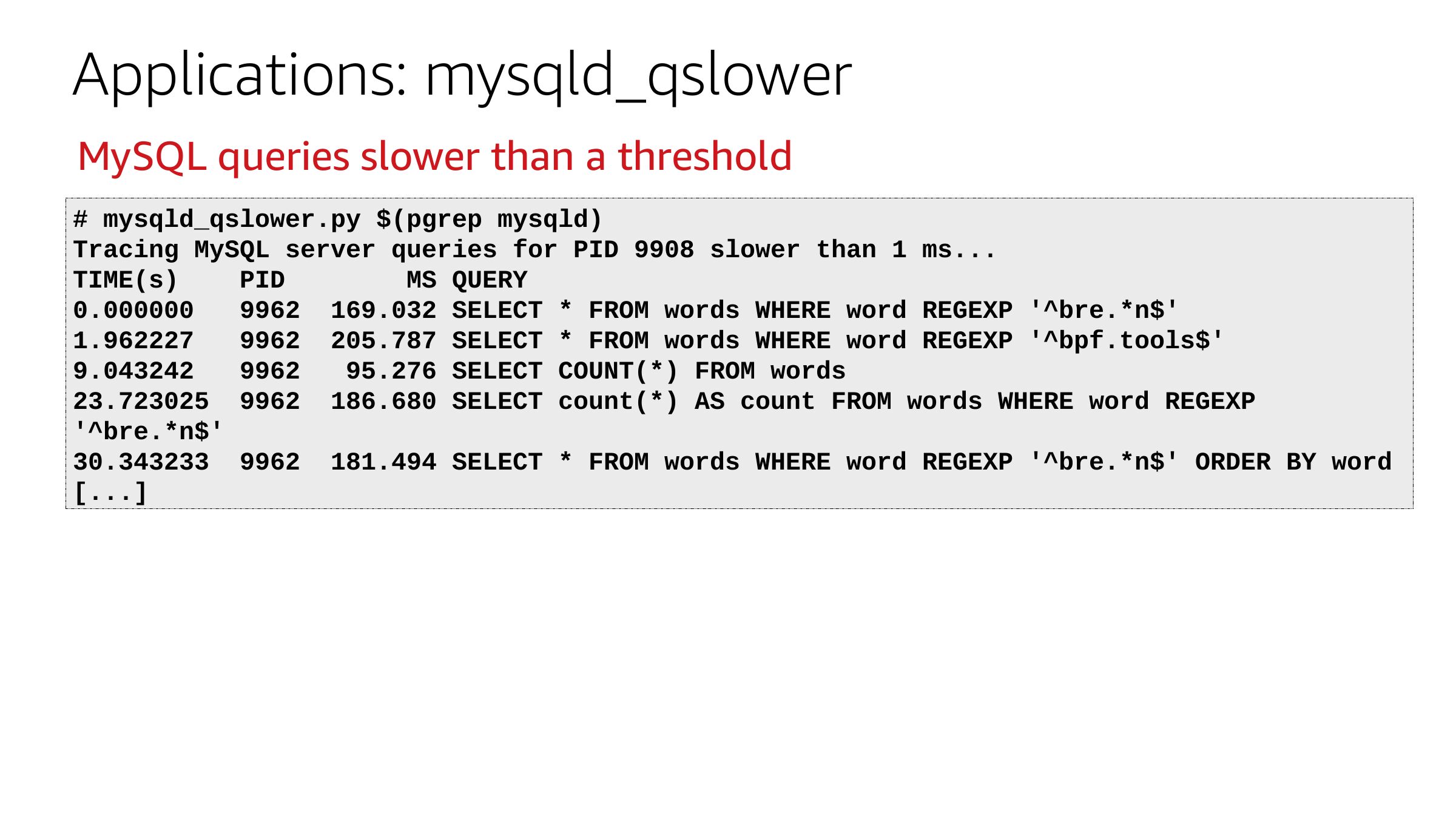 Applications: mysqld_qslower MySQL queries slower than a threshold # mysqld_qslower.py $(pgrep mysqld) Tracing MySQL server queries for PID 9908 slower than 1 ms... TIME(s) PID MS QUERY 9962 169.032 SELECT * FROM words WHERE word REGEXP '^bre.*n$' 9962 205.787 SELECT * FROM words WHERE word REGEXP '^bpf.tools$' 95.276 SELECT COUNT(*) FROM words 23.723025 9962 186.680 SELECT count(*) AS count FROM words WHERE word REGEXP '^bre.*n$' 30.343233 9962 181.494 SELECT * FROM words WHERE word REGEXP '^bre.*n$' ORDER BY word [...]slide 40: