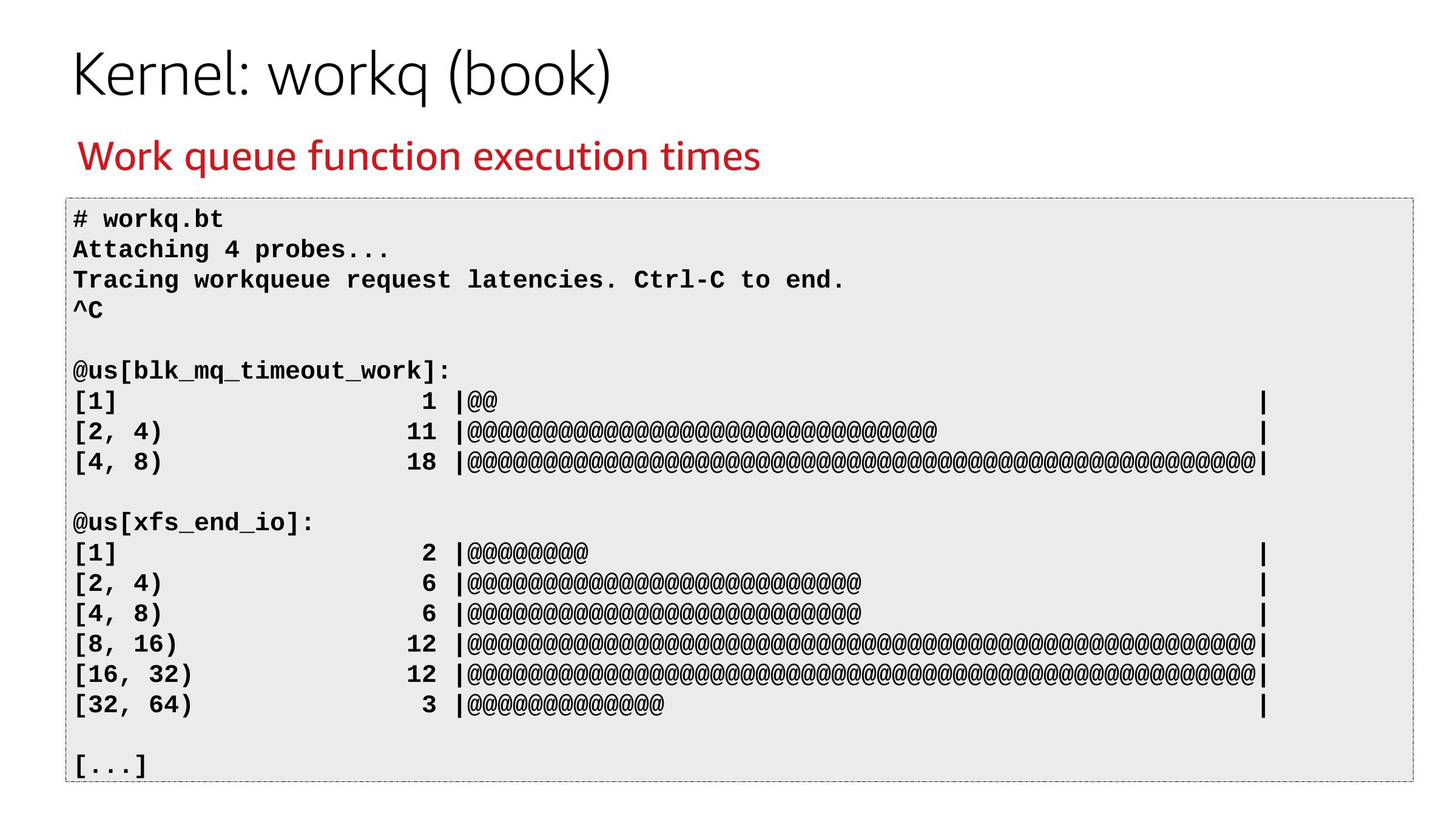 Kernel: workq (book) Work queue function execution times # workq.bt Attaching 4 probes... Tracing workqueue request latencies. Ctrl-C to end. @us[blk_mq_timeout_work]: [1] 1 |@@ [2, 4) 11 |@@@@@@@@@@@@@@@@@@@@@@@@@@@@@@@ [4, 8) 18 |@@@@@@@@@@@@@@@@@@@@@@@@@@@@@@@@@@@@@@@@@@@@@@@@@@@@| @us[xfs_end_io]: [1] [2, 4) [4, 8) [8, 16) [16, 32) [32, 64) [...] 2 |@@@@@@@@ 6 |@@@@@@@@@@@@@@@@@@@@@@@@@@ 6 |@@@@@@@@@@@@@@@@@@@@@@@@@@ 12 |@@@@@@@@@@@@@@@@@@@@@@@@@@@@@@@@@@@@@@@@@@@@@@@@@@@@| 12 |@@@@@@@@@@@@@@@@@@@@@@@@@@@@@@@@@@@@@@@@@@@@@@@@@@@@| 3 |@@@@@@@@@@@@@slide 41: