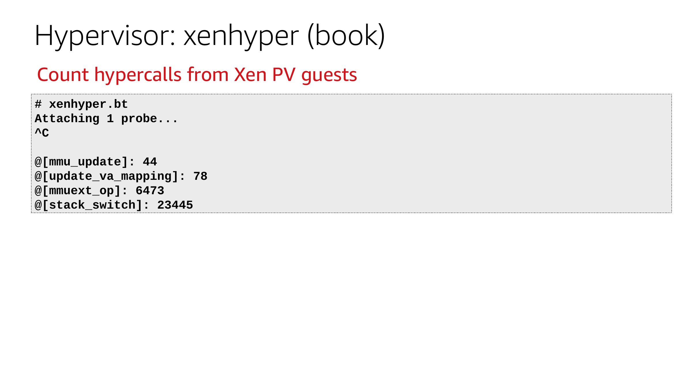 Hypervisor: xenhyper (book) Count hypercalls from Xen PV guests # xenhyper.bt Attaching 1 probe... @[mmu_update]: 44 @[update_va_mapping]: 78 @[mmuext_op]: 6473 @[stack_switch]: 23445slide 42: