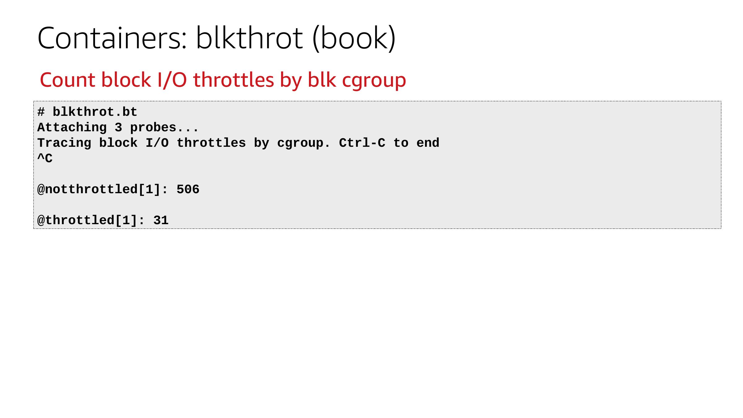 Containers: blkthrot (book) Count block I/O throttles by blk cgroup # blkthrot.bt Attaching 3 probes... Tracing block I/O throttles by cgroup. Ctrl-C to end @notthrottled[1]: 506 @throttled[1]: 31slide 43: