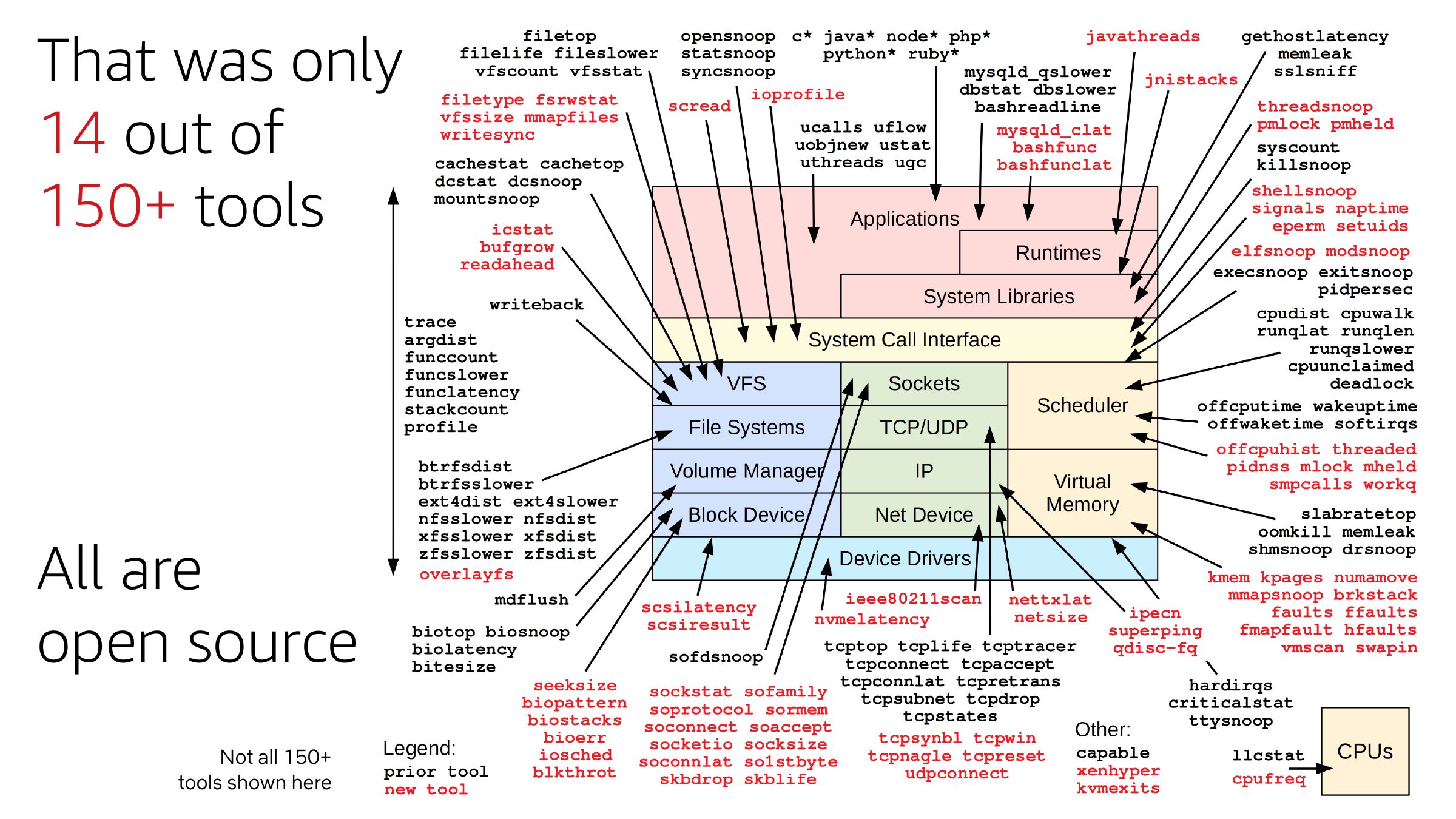 Tool Examples by Subsystem 1. CPUs (scheduling) 2. Memory 3. Disks 4. File Systems 5. Networking 6. Languages 7. Applications 8. Kernel 9. Hypervisors 10. Containersslide 28: