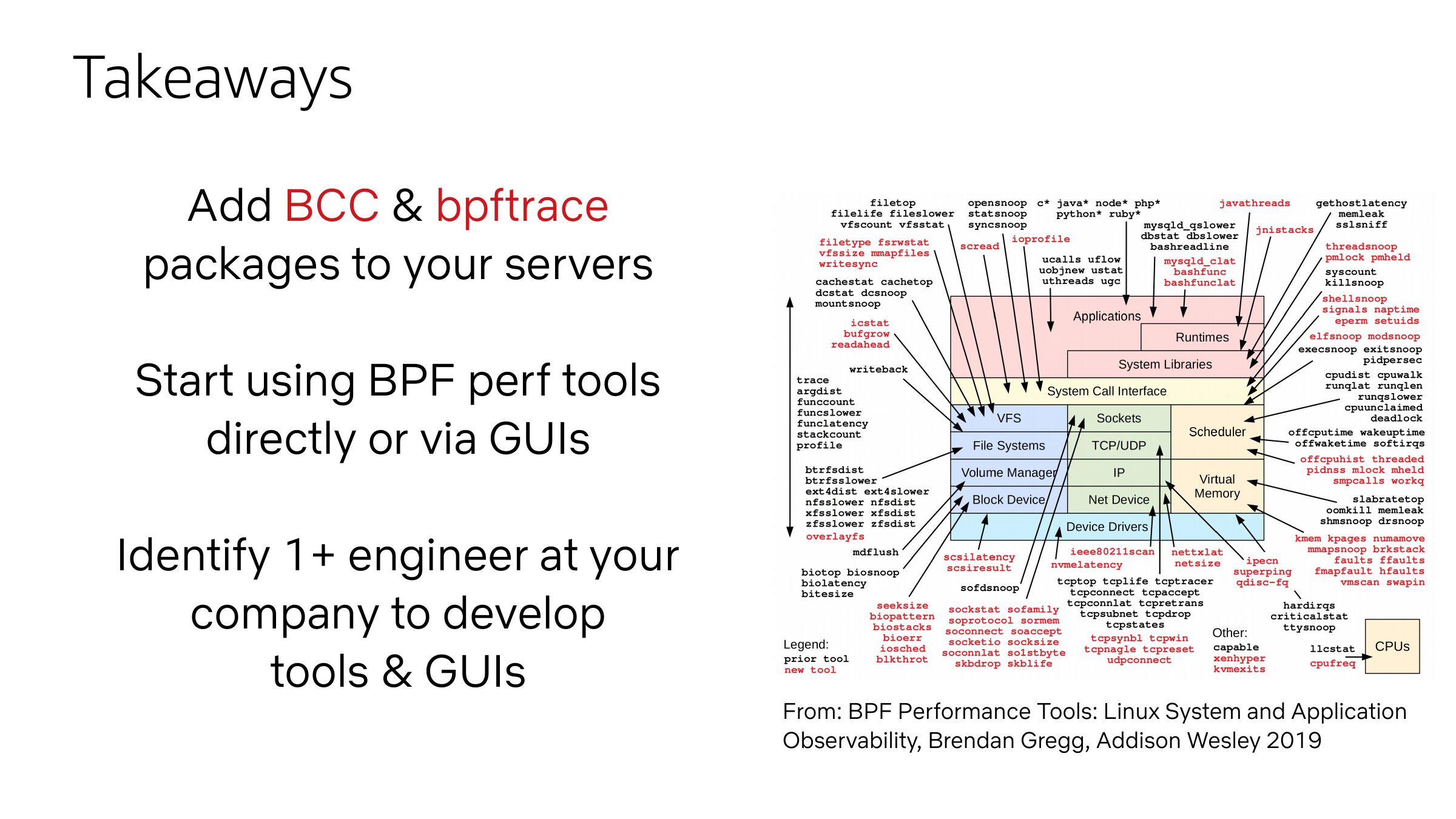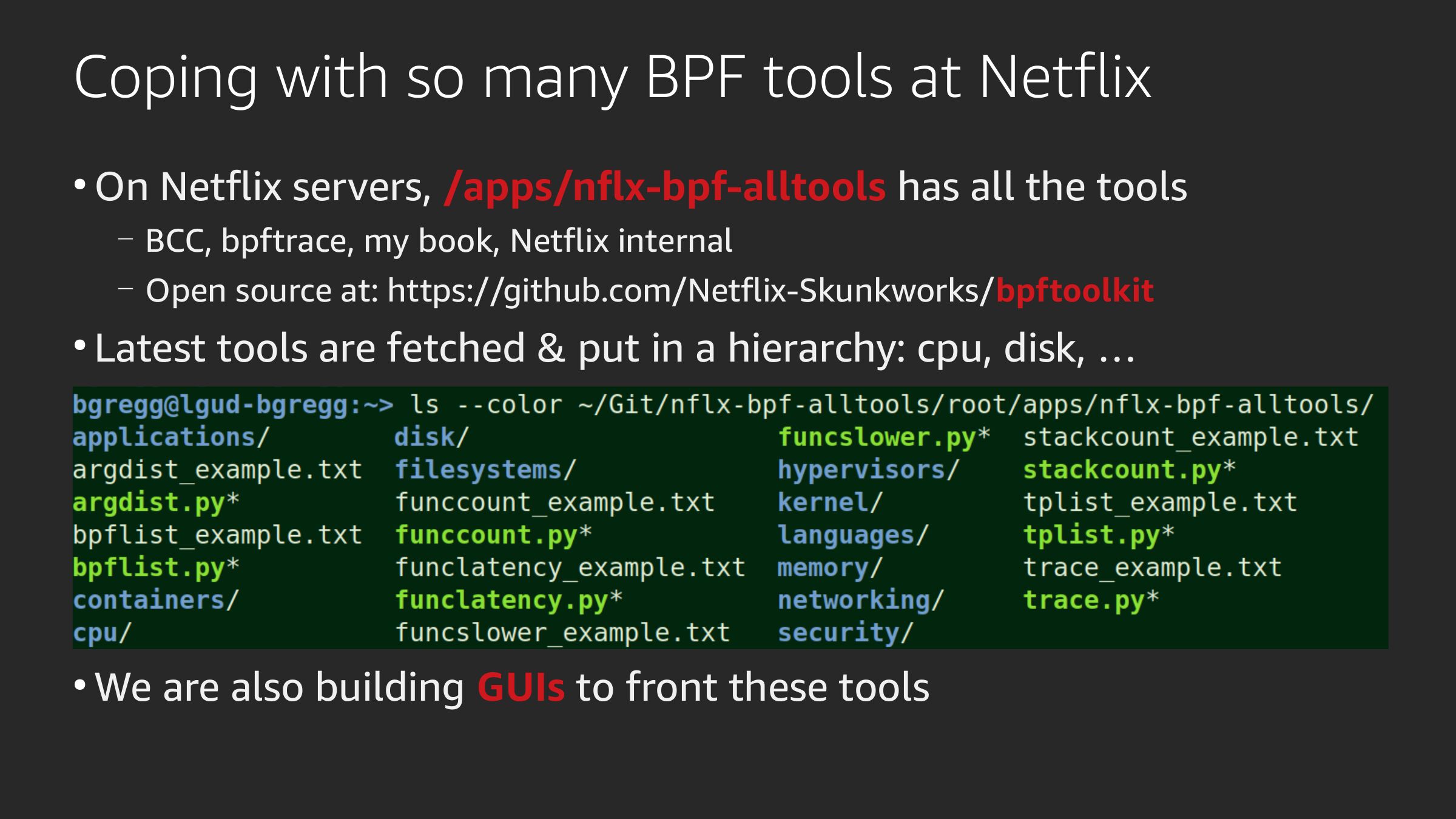 Coping with so many BPF tools at Netflix On Netflix servers, /apps/nflx-bpf-alltools has all the tools BCC, bpftrace, my book, Netflix internal Open source at: https://github.com/Netflix-Skunkworks/bpftoolkit Latest tools are fetched & put in a hierarchy: cpu, disk, … We are also building GUIs to front these toolsslide 45: