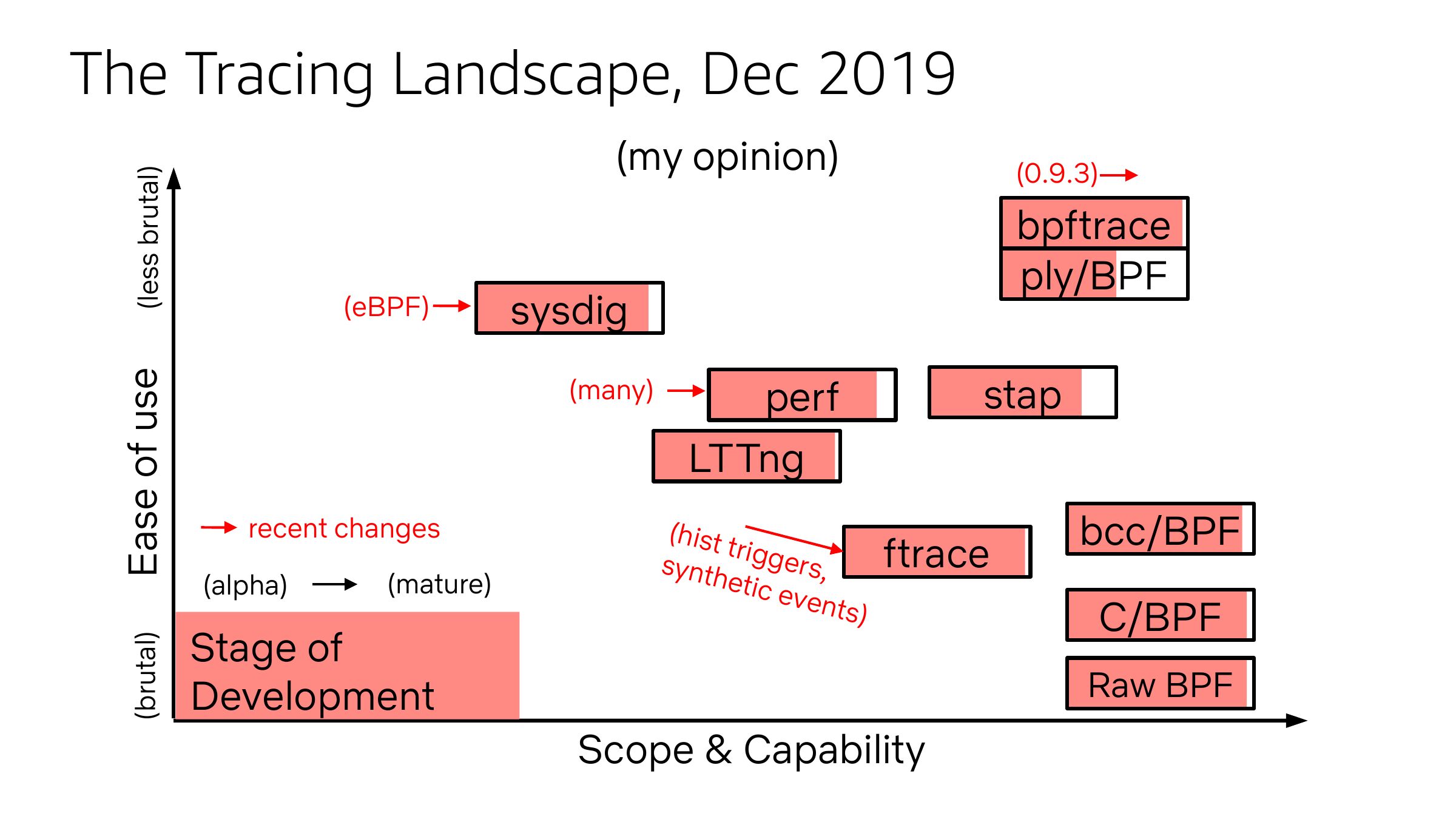 The Tracing Landscape, Dec 2019 (brutal) Ease of use (less brutal) (my opinion) (eBPF) (0.9.3) bpftrace ply/BPF sysdig (many) perf stap LTTng recent changes (alpha) (mature) Stage of Development (hist trigg ftrace ers, synth etic e vents bcc/BPF C/BPF Raw BPF Scope & Capabilityslide 48: