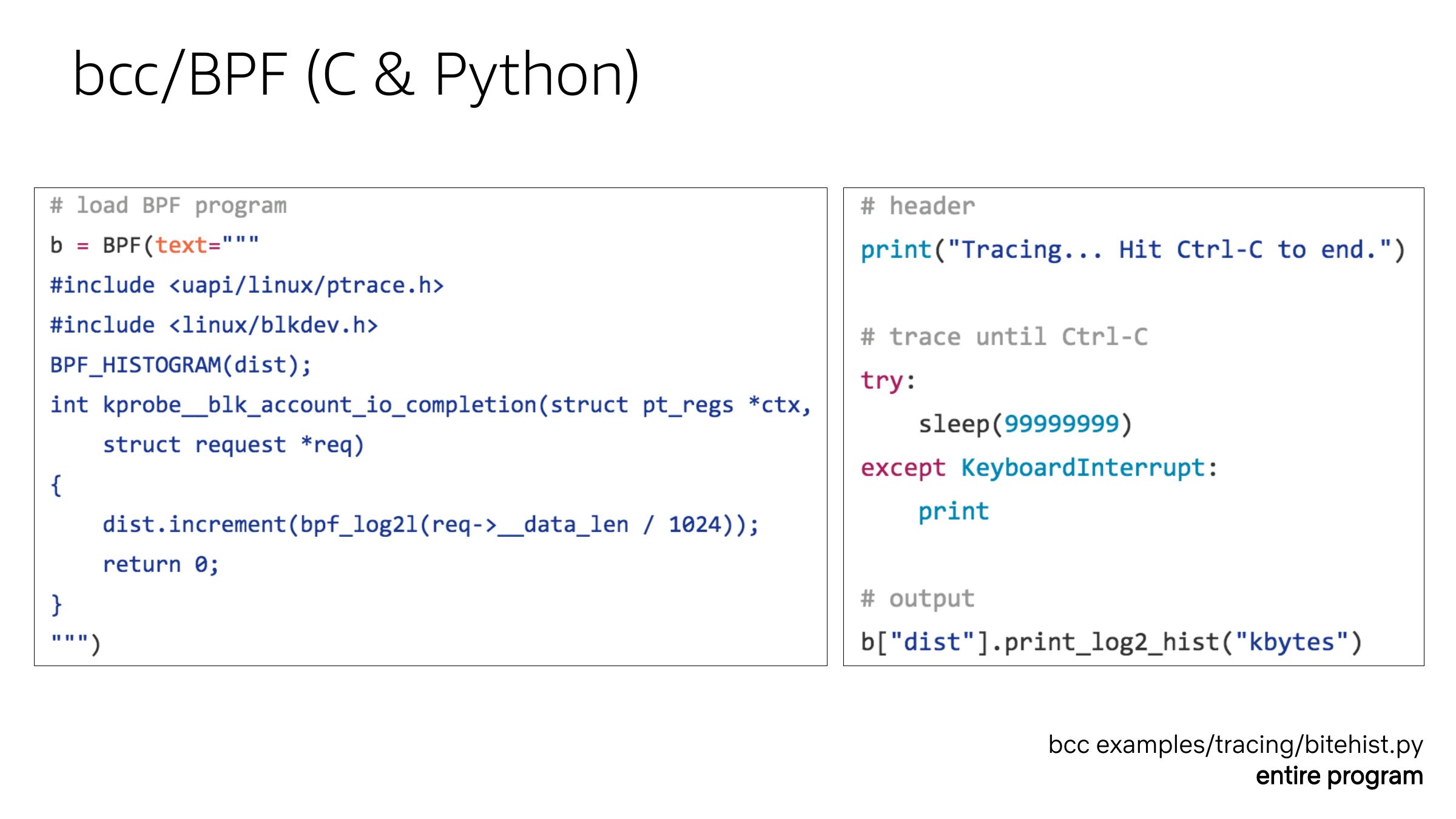bcc/BPF (C & Python) bcc examples/tracing/bitehist.py entire programslide 49: