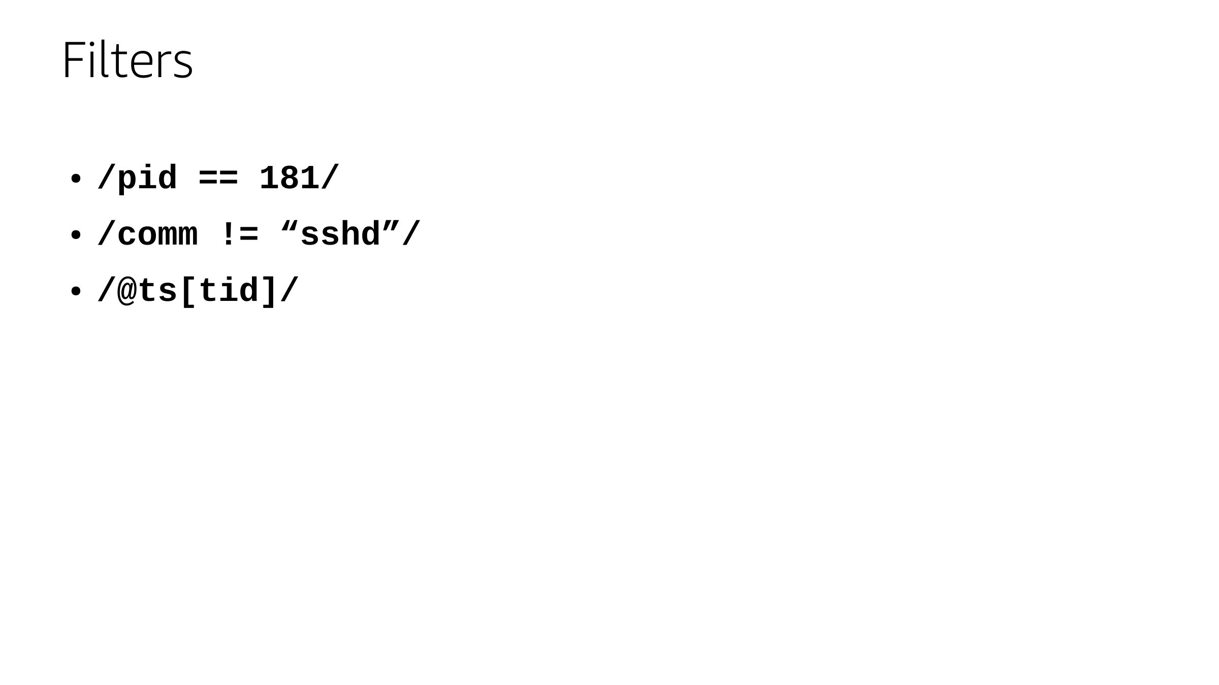 Filters /pid == 181/ /comm != “sshd”/ /@ts[tid]/slide 53: