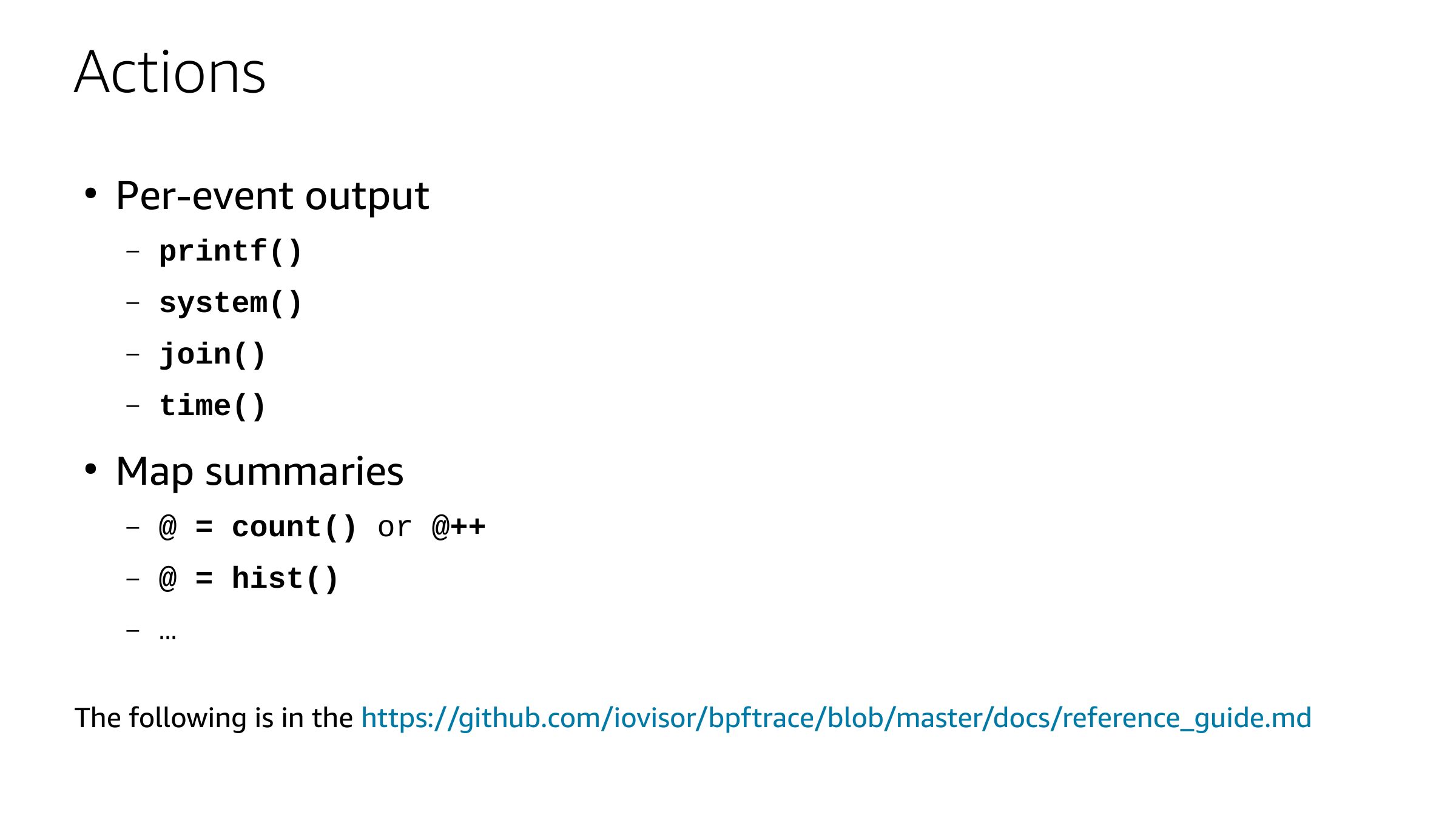 Actions Per-event output printf() system() join() time() Map summaries @ = count() or @++ @ = hist() The following is in the https://github.com/iovisor/bpftrace/blob/master/docs/reference_guide.mdslide 54: