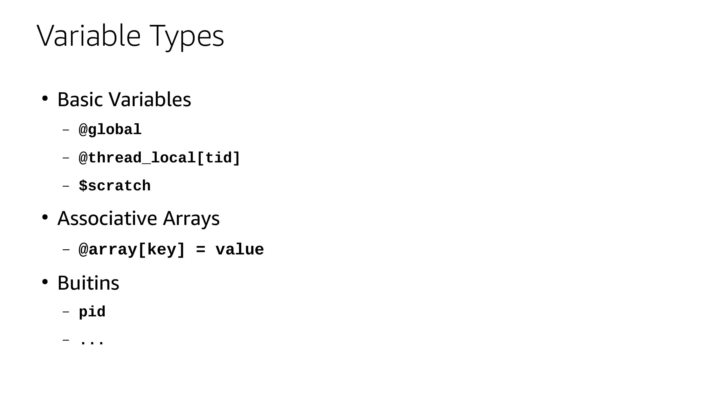 Variable Types Basic Variables @global @thread_local[tid] $scratch Associative Arrays @array[key] = value Buitins pidslide 56: