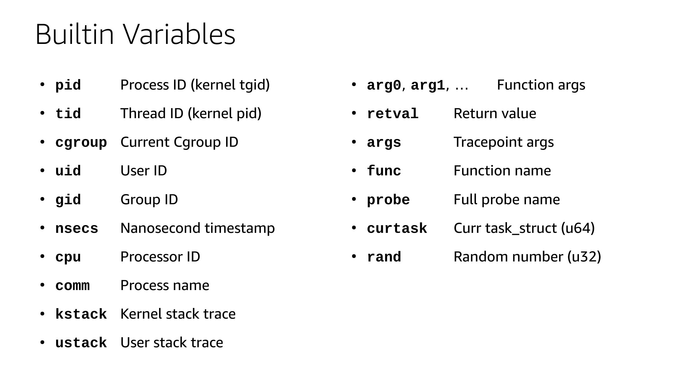 Builtin Variables pid Process ID (kernel tgid) arg0, arg1, … Function args tid Thread ID (kernel pid) retval Return value cgroup Current Cgroup ID args Tracepoint args uid User ID func Function name gid Group ID probe Full probe name nsecs Nanosecond timestamp curtask Curr task_struct (u64) cpu Processor ID rand Random number (u32) comm Process name kstack Kernel stack trace ustack User stack traceslide 57: