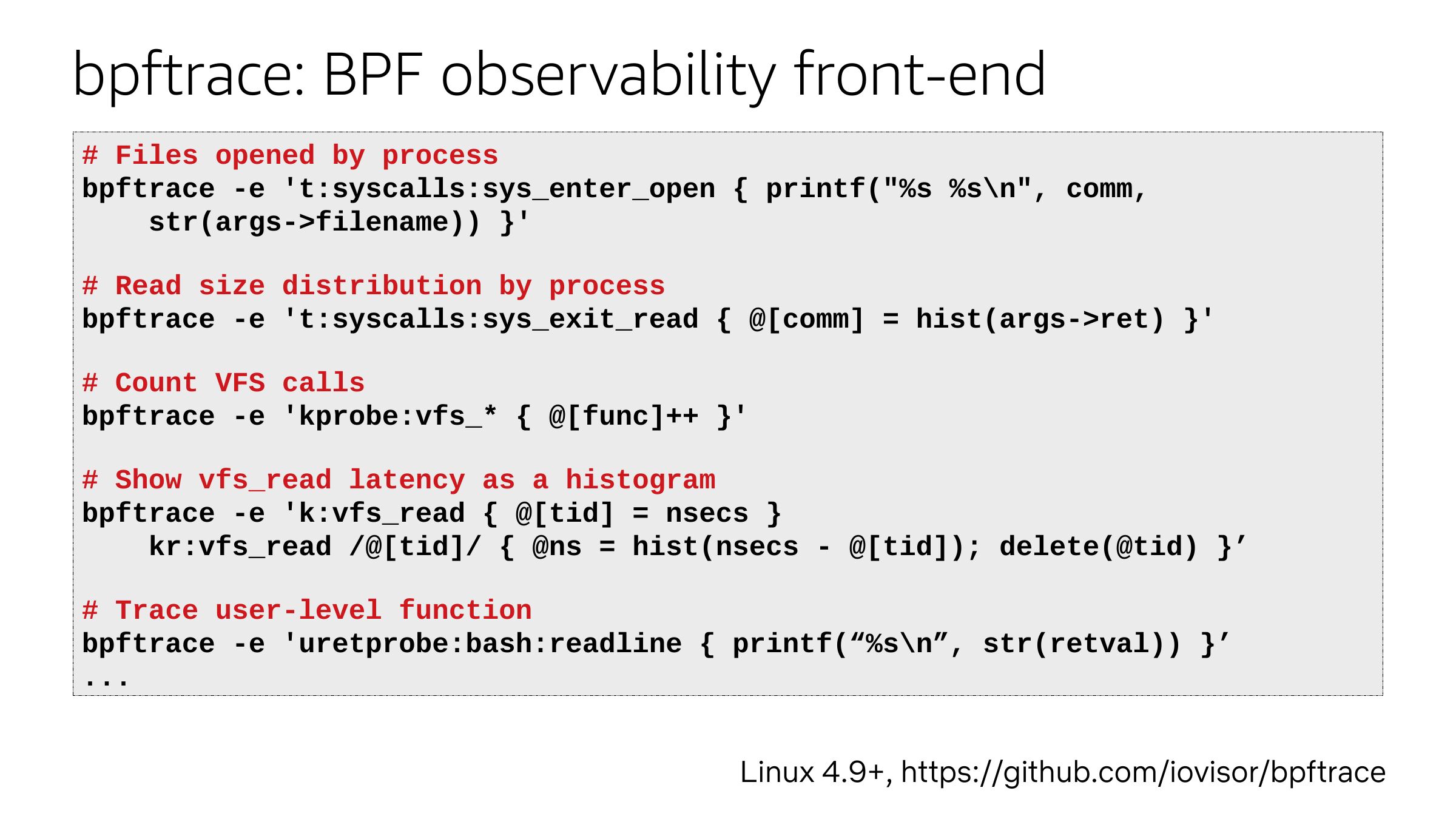 Linux 4.9+, https://github.com/iovisor/bpftrace