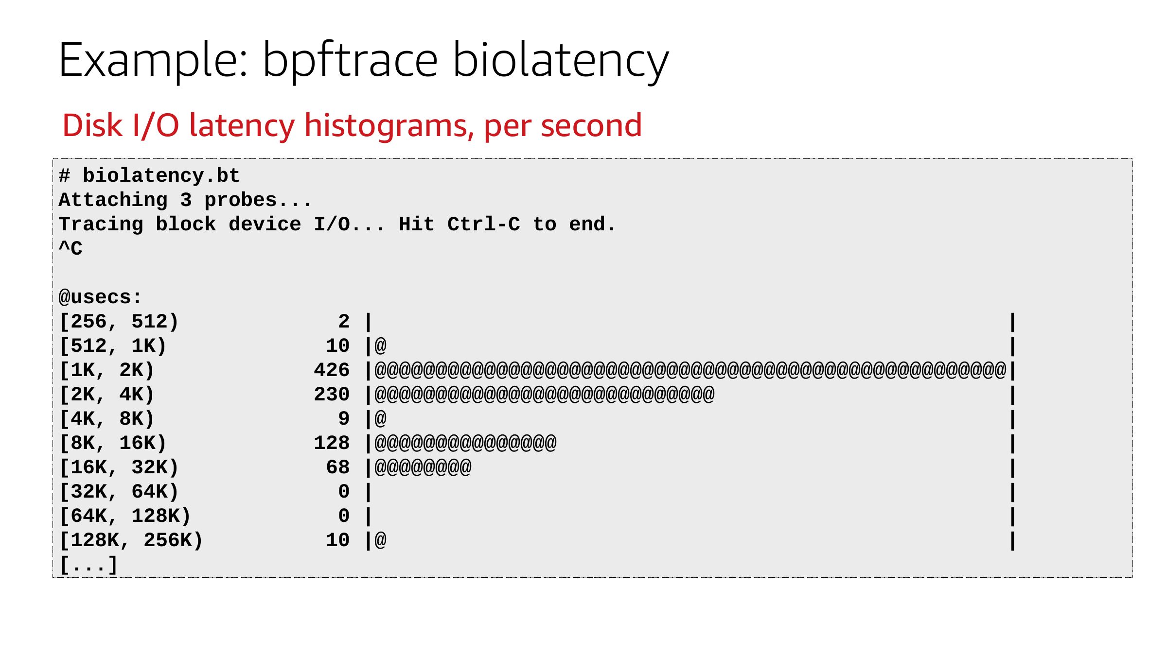 slide 58:Example: bpftrace biolatency Disk I/O latency histograms, per second # biolatency.bt Attaching 3 probes... Tracing block device I/O... Hit Ctrl-C to end. @usecs: [256, 512) [512, 1K) [1K, 2K) [2K, 4K) [4K, 8K) [8K, 16K) [16K, 32K) [32K, 64K) [64K, 128K) [128K, 256K) [...] 2 | 10 |@ 426 |@@@@@@@@@@@@@@@@@@@@@@@@@@@@@@@@@@@@@@@@@@@@@@@@@@@@| 230 |@@@@@@@@@@@@@@@@@@@@@@@@@@@@ 9 |@ 128 |@@@@@@@@@@@@@@@ 68 |@@@@@@@@ 0 | 0 | 10 |@slide 59:
