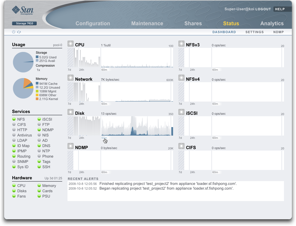 In this entry I'll write about the Status Dashboard, a summary of appliance status written by myself and the Fishworks engineering team for the Sun Storage 7xxx series of NAS appliances (released today). This is of interest beyond the scope of NAS, as a carefully designed solution to a common problem: summarizing the status of a complex system.