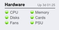 Like Services, the Hardware section uses traffic lights to summarise the status of key hardware components. If clustering is configured, and extra light is displayed for cluster status. The status is mostly retrieved from FMA (Fault Management Architecture from Solaris 10).