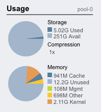 The Usage area shows usage of the storage pool and main memory. The values are listed and represented as pie charts.