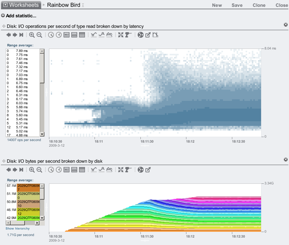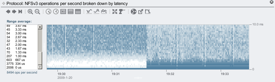 The x-axis is time, the y-axis is the I/O latency, and color is used to represent a 3rd dimension: how many I/O requests occurred at that time, at that latency (darker means more). Gathering this much detail from the operating system was not only made possible by DTrace, but also made optimal. DTrace already has the ability to group data into buckets, which is used to provide a sufficient resolution of data for plotting. Higher resolutions are kept for lower latencies: having 10 microsecond resolution for I/O times less than 1,000 microseconds is useful, but overkill for I/O times over 1,000,000 microseconds (1 second), and would waste disk space when storing it. Analytics automatically picks a resolution suitable for the range displayed.