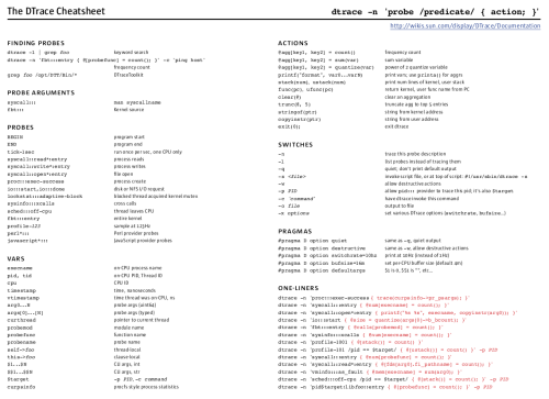 Here is my DTrace cheatsheet, styled by Todd. This doesn't include all of DTrace – it includes what I use most frequently. As a reminder, I flicked through the DTraceToolkit to see what I frequently used in those scripts.