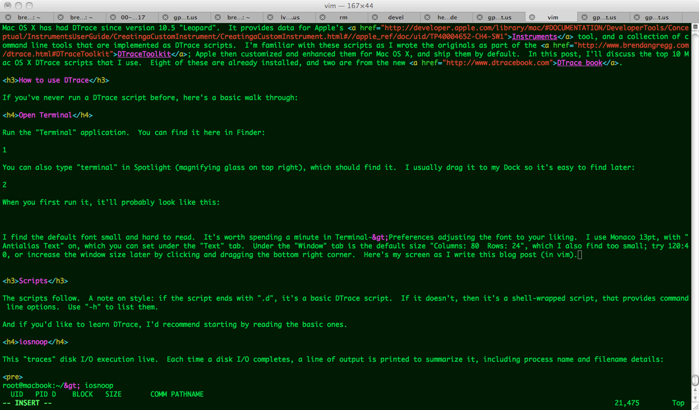 In this post, I’ll cover the top ten Mac OS X DTrace scripts that I use for figuring out why laptops are slow or why applications are misbehaving. Most of these scripts are already installed, a few are from the new DTrace book.