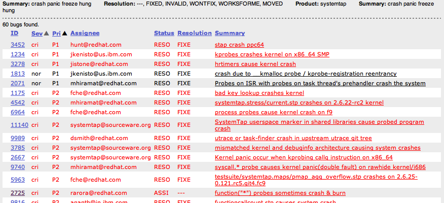 When you go to file a bug, search to see if it's already there. I search for both open and closed bugs, as I may have hit a bug that's recently been closed (fixed), but not on the version of SystemTap I'm running. In which case, I'll still find the bug, notice that the fix date was recent, and then go refresh to the latest SystemTap. Here's an example search: