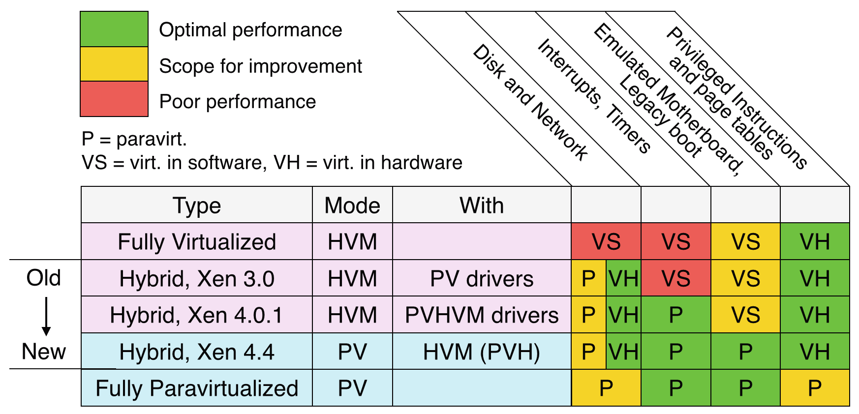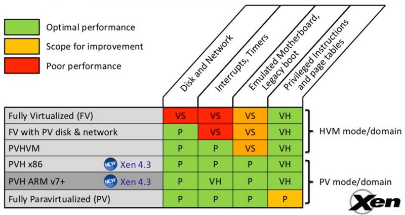 Xen has been developing additional hybrid modes for the best of both words, where a HVM guest can use faster PV kernel parts, or vice versa. At first, PV disk and network drivers on HVM were possible. Then, interrupts and timers. Each of these moves reduced the need for slower emulation, such as via QEMU, improving performance. This is all summarized pretty well by the spectrum diagram.