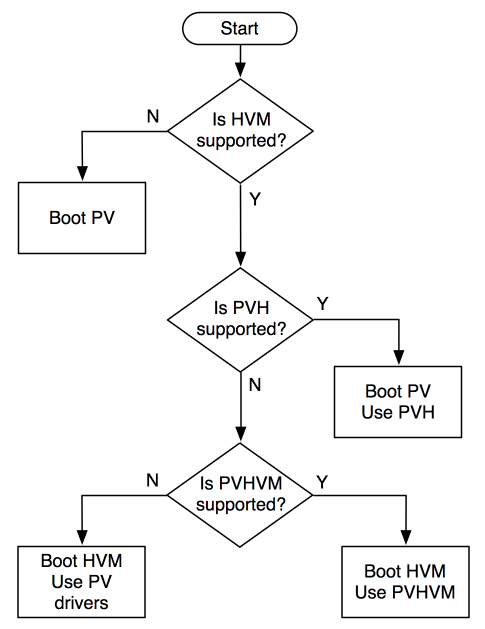 • HVM: Until PVH, choose this. Xen, and the guest kernel, are likely to support a number of enhancements which use PV code paths, so the booted instance will be a hybrid. The number of enhancements depends on the Xen and guest kernel versions: newer for more.