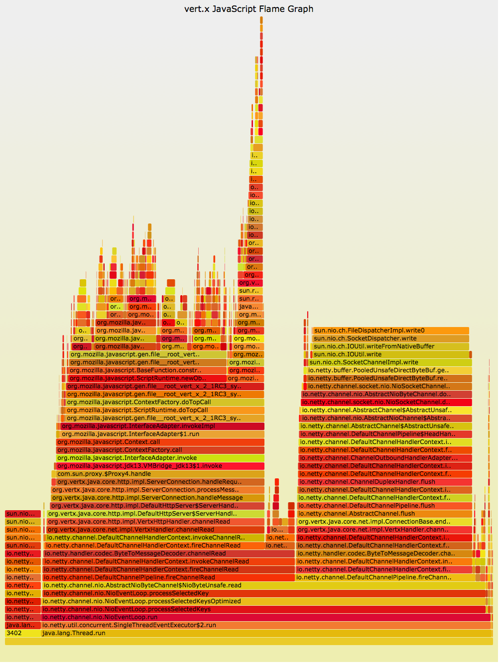 The large tower on the left is the Mozilla Rhino JavaScript engine, which is eating 42.70% CPU (look for the lowest mozilla frame; the percentage is inclusive of all child frames above it). vert.x with Java doesn't need to run this engine, freeing up those CPU resources, and roughly doubling maximum possible performance.