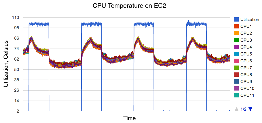 The image on the right shows how CPU temperatures, measured using MSRs on an EC2 instance, vary based on CPU utilization (in blue). The workload is synthetic: all CPUs driven to 100% utilization for 5 minutes, then to 0% for a while, repeat. What's interesting is that temperature rises initially with CPU load, then drops sharply. Did system fans kick in? (So far I haven't found fan RPM MSRs, to confirm.)