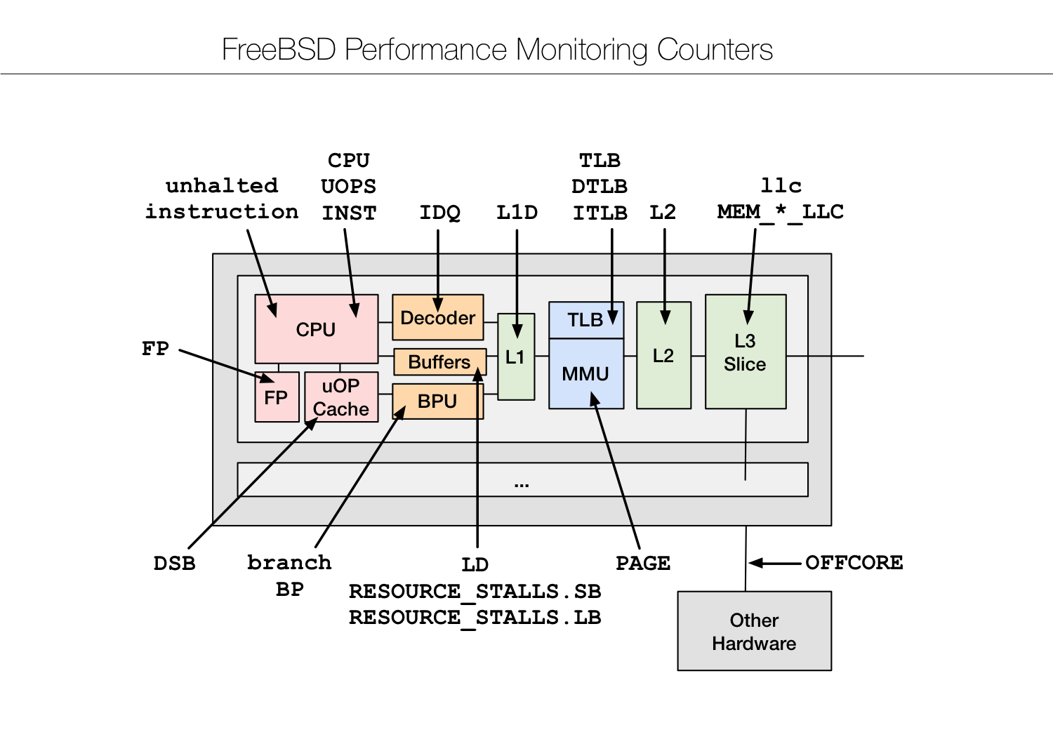 This is also an example of how more developed performance analysis is on FreeBSD: I tried to create this diagram for Linux perf_events for my SCALE 13x talk, but it was lacking so many PMC groups that I didn't use it. Linux can get the job done, but more often you'll need to use the raw PMC counter specifications from the Intel manual. Stuck in second gear again.